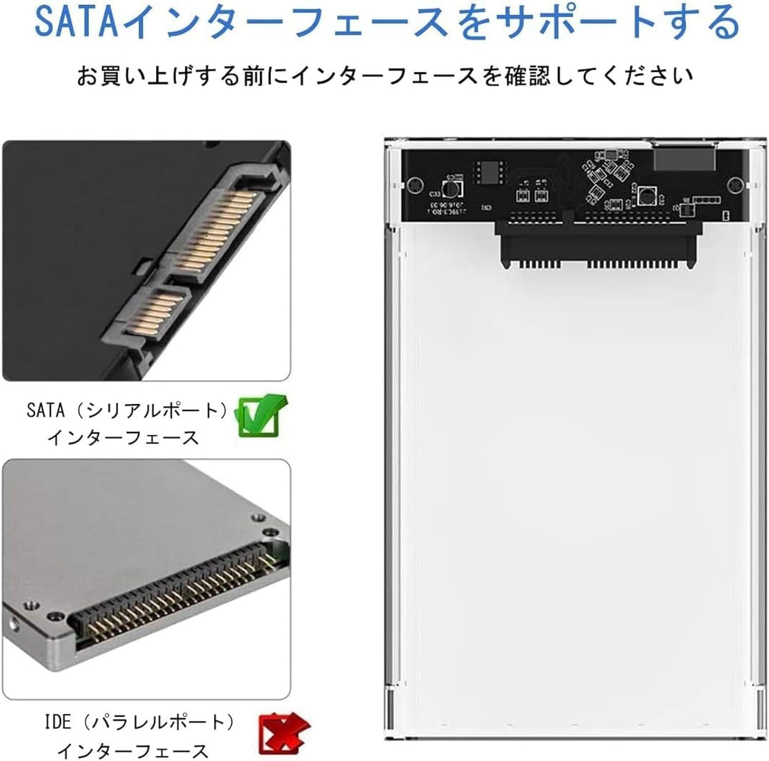 【透過性のあるデザイン】透過性のある筐体で、内部構造がはっきり見えるように設計されており、HDD/SSDのモデルとサイズが一目でわかります。
