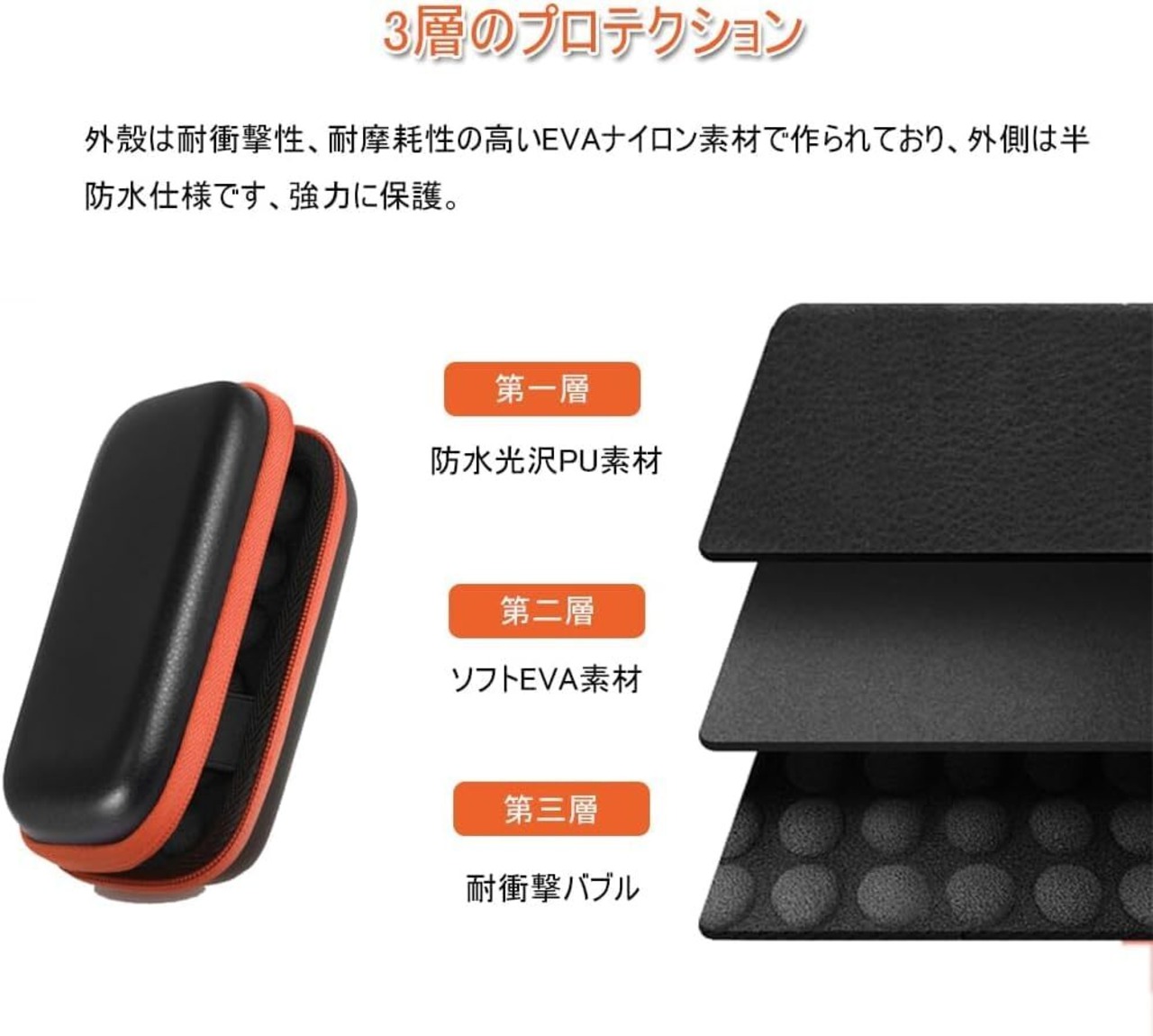 【材質】外殼は耐衝撃性、耐摩耗性の高いEVAナイロン素材で作られており、外側は半防水仕様です。強力に保護し、デバイスの持ち運びや使用を安心して行うことができます。