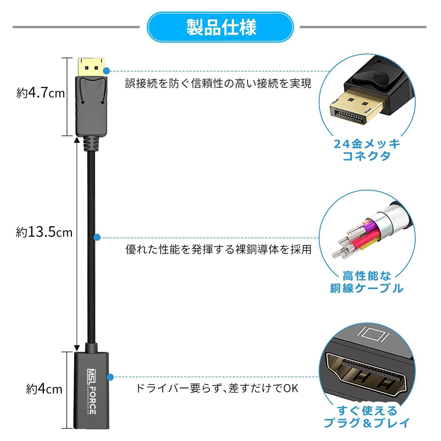 【優れた安定性】24k金メッキ処理を施したDisplayPortオスおよびHDMIコネクタは腐食や摩耗、サビに強いです。多重シールド処理によって信号のロスやノイズ等を最低限まで抑え、安定した映像音声を提供します。