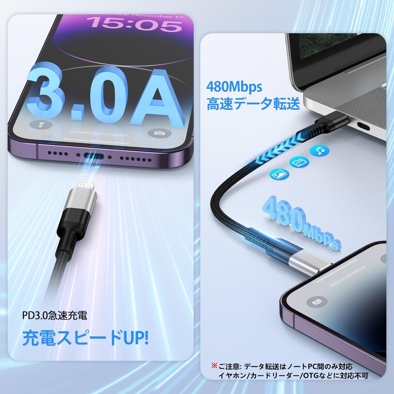 【急速充電&データ転送】USB Cケーブル一本がある限り、3Aの急速充電と最大スピードでの高速データ伝送可能です。最新のPDチップとe-markerスマートチップを内蔵し、充電中は常に安全で安定した高速充電が可能です。最大480Mbpsのデータ転送速度もサポートしています。 →→[※この製品はデータ転送をサポートしていますが、OTG機能/外付メモリはサポートしていません。スマートフォンやiPadからノートパソコン以外のデバイスへのデータ転送はできません。*USB-C電源アダプタをご使用ください。]