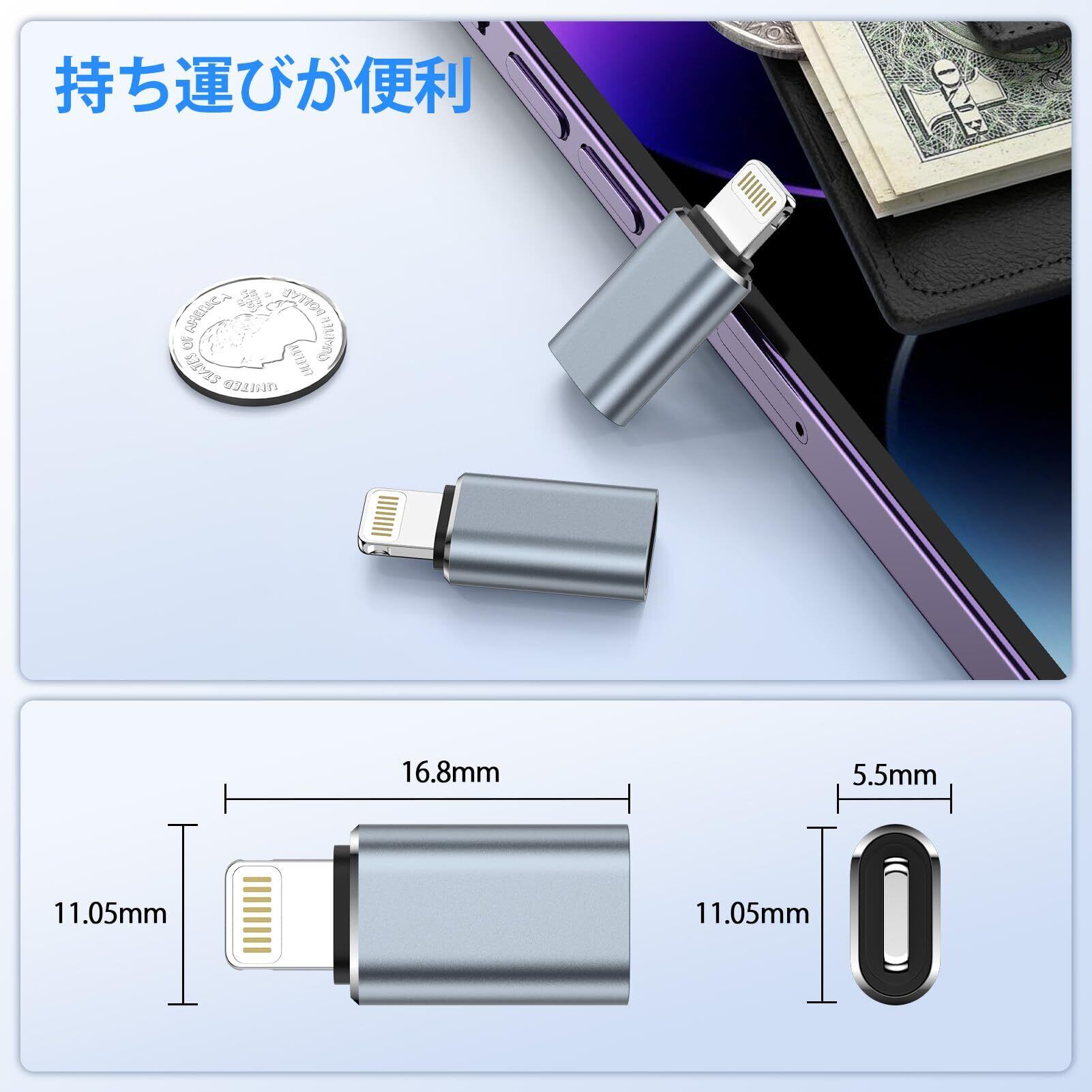 【小型で軽量&携帯に便利】USB-C IOS 変換コネクタは裏表に関係なく両面挿せるデザインを採用し、より快適に使用できます。縦横高さ全てで小型化、軽量化を実現して持ち運びやすいです。財布・ポケットにしまえて、場所を取りません。