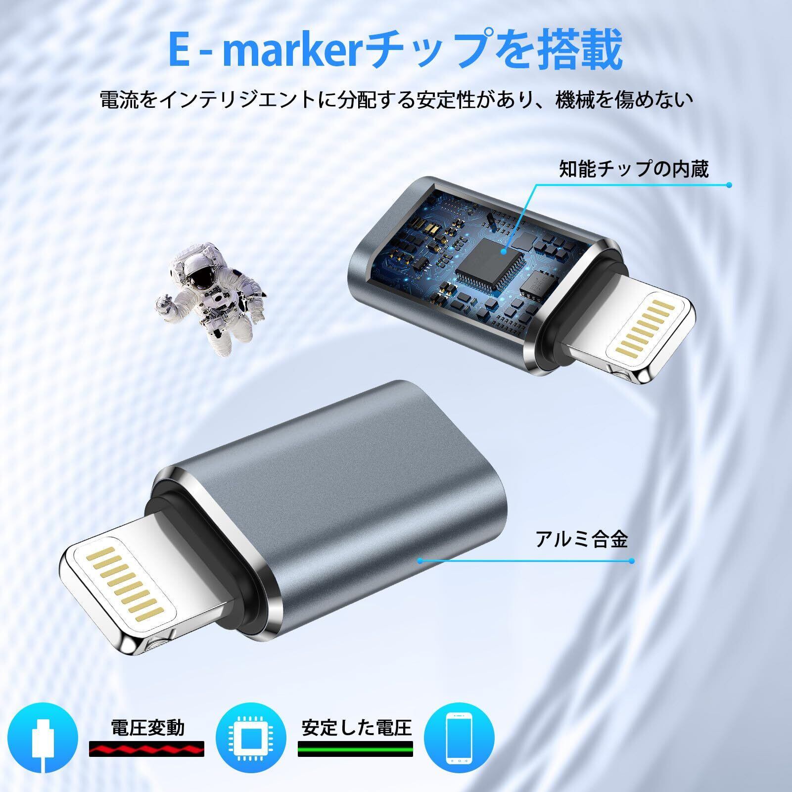 【知能チップ搭載&高品質素材】内蔵されたスマートチップが接続した機器の電流電圧を自動調節し、安定した急速充電を行います。過充電・損傷・発熱を防ぐ安全設計です。アルミ合金素材を採用して、高速に放熱可能ですし、性能が安定しています。精密なiPhone 変換アダプタにより、スムーズに抜き差すことが可能です。インターフェースは平らで、ぴったりとフィットし、緩みません。