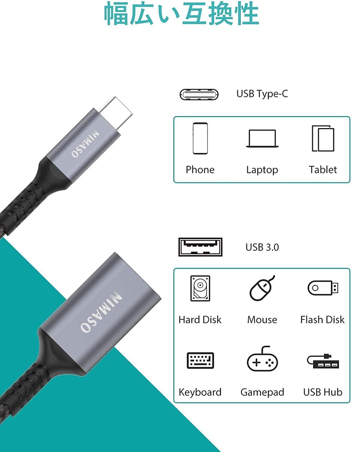 NIMASO USB C 変換 アダプタ (Type C - USB 3.0 メス) 20CM OTG ケーブル タイプC 変換コネクター (1本入り, グレー)