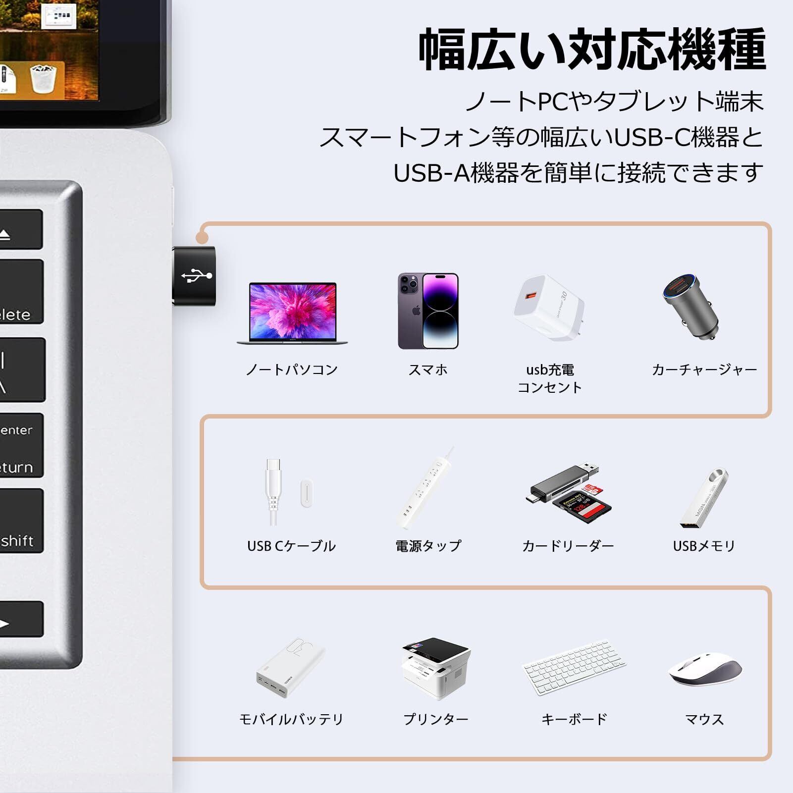 対応デバイス USB Aポートを備えたPC端末またはACアダプタ、USBハブ, スマホ、HDD、またはその他のUSB-Cデバイスなど