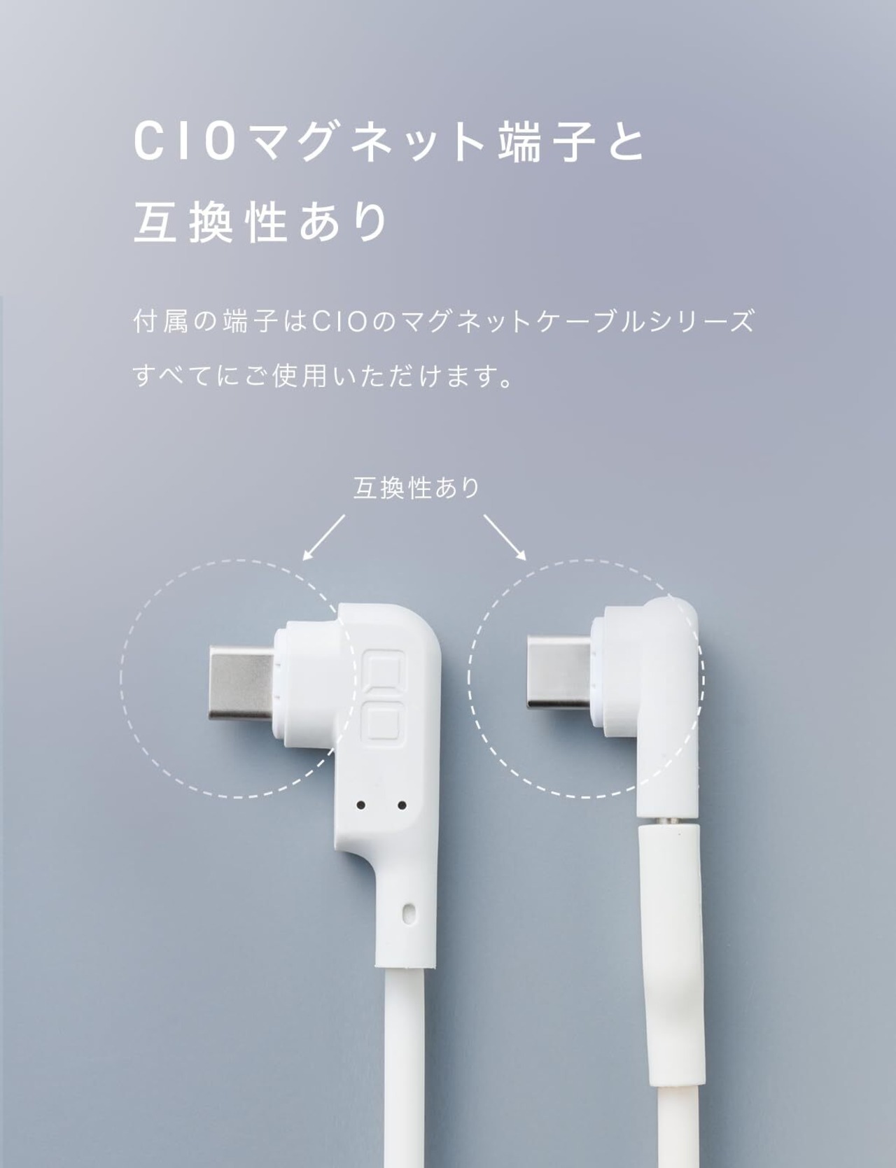 【お手持ちのケーブルをマグネット化!】CIOマグネット変換アダプタは、お手持ちのUSB type-Cケーブルを便利なL字マグネットケーブルに早変わりさせるコンバージョンパーツです。CIOマグネットケーブルの端子と互換性がありますので、マグネットケーブルに差し替えて余ったケーブルをマグネット化させるなど、幅広くご活用いただくことが可能です。
