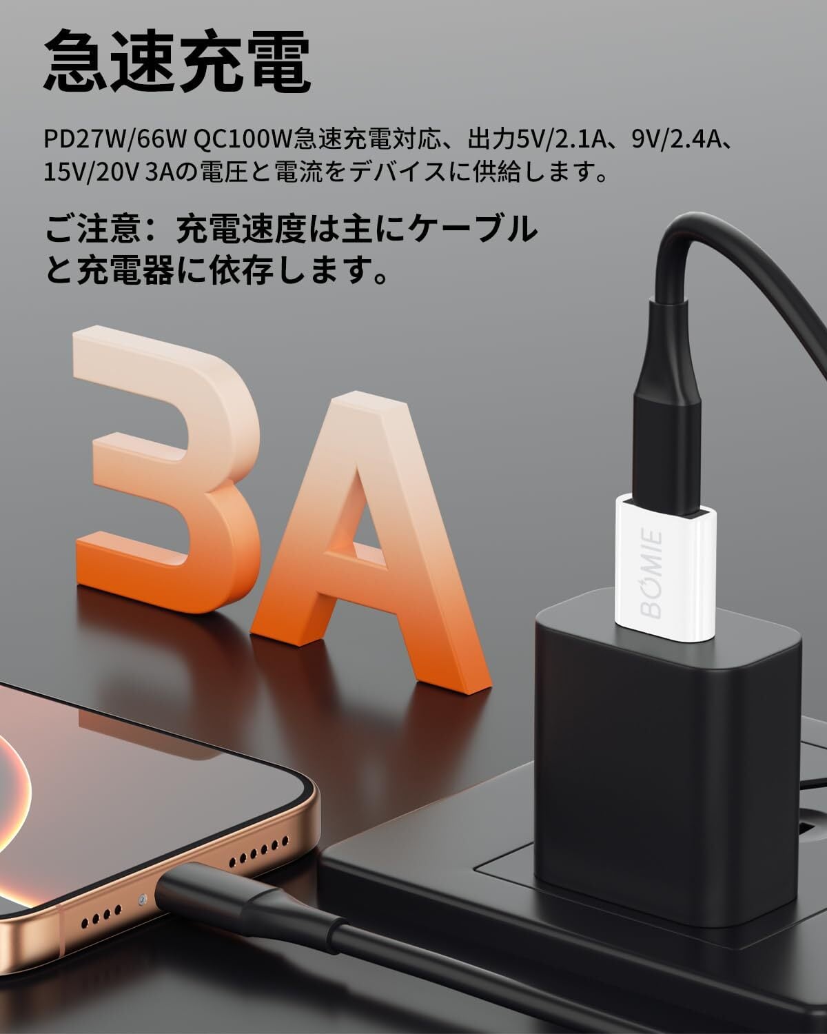 USB3.0 急速充電:このType-C (メス) to USB 3.0 (オス) 変換アダプタはQC3.0/2.0、AFC、FCP急速充電プロトコルをサポートし、PD27W/66W QC100W電源をサポートし、5V/2.1A、9V/2.4A、15V/20V 3Aの電圧と電流を出力し、スマートフォン、タブレットなどのデバイスの急速充電の需要を満たします。 充電の安全性を確保するため、必ず指定された電流範囲内でご使用ください。
