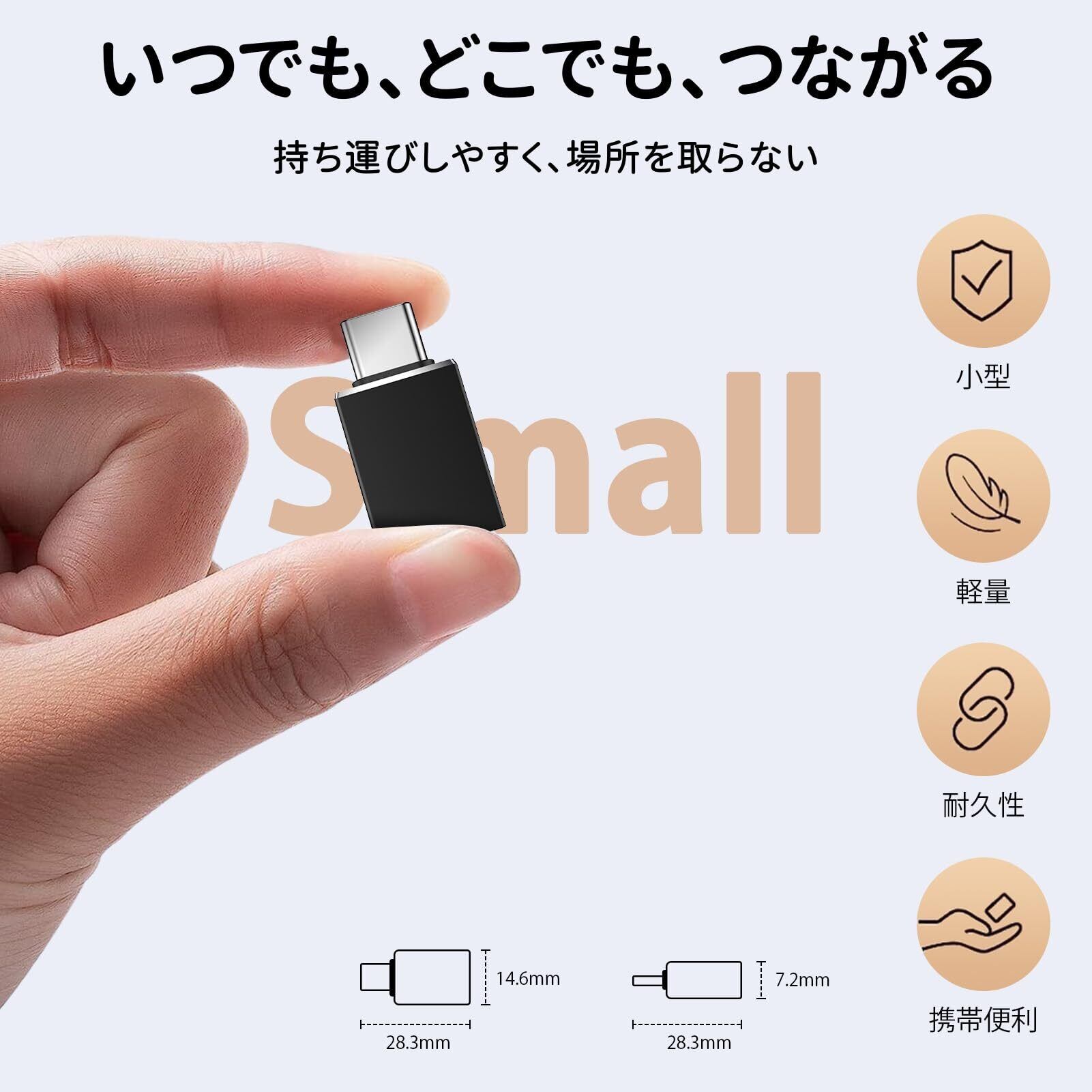 【小型で持ち運びしやすく】usb タイプc 変換アダプタ。小型化、軽量化を実現、アルミ合金製で安全かつ省スペースのボディは高級感があり、耐久性と耐衝撃性に優れています。わずか28.3x14.6x7.2mmのサイズで、収納しやすくて、旅行中、自宅、職場などで持ち運びが簡単です。