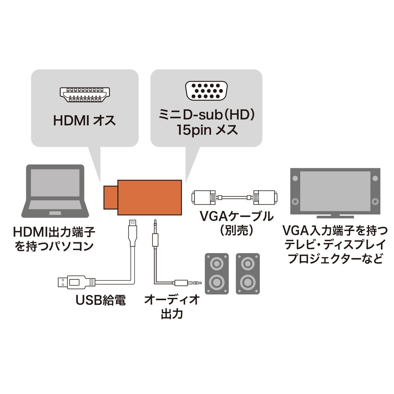 HDMI出力を持つ機器の映像信号をVGAコネクタ(ミニD-Sub(HD)15pin)に変換するアダプタです。※ディスプレイ側のHDMIコネクタをVGAコネクタ(ミニD-sub(HD)15pin)に変換することはできません。
