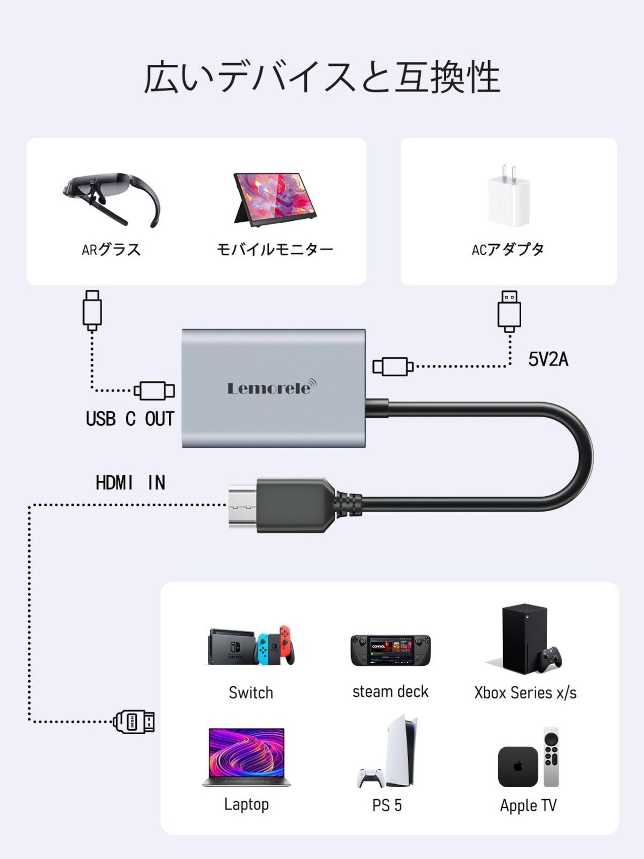【HDMI to USB C 交換アダプター】ノートパソコン、Fire stickTV、ゲーム機、DVDプレーヤーなどHDMI端子を搭載した、ビデオ出力をサポートするデバイスのHDMIインターフェースに常に挿入してください。 また、このアダプターの電源供給には、パッケージ内のUSB-Cケーブルを使用する必要があります。【注意】:本アダプターHDMI to USB-C方向交換だけ、逆方向:USB-C to HDMI 交換転送を対応しません!