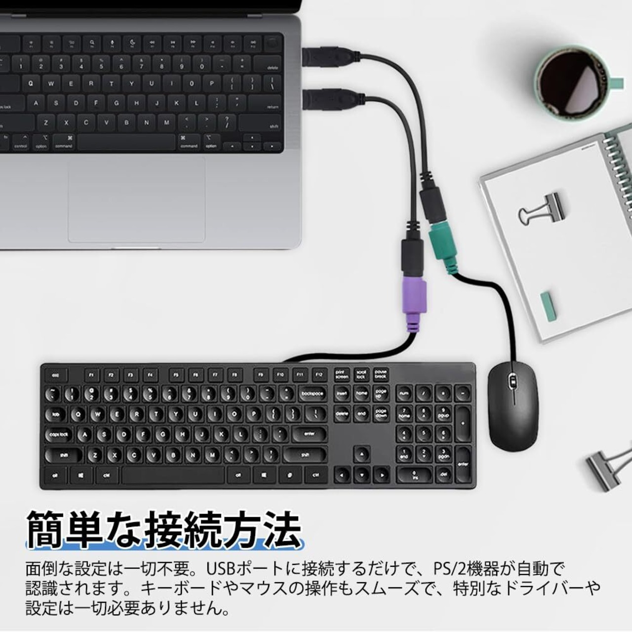 4.【簡単な接続方法】面倒な設定は一切不要。USBポートに接続するだけで、PS/2機器が自動で認識されます。キーボードやマウスの操作もスムーズで、特別なドライバーや設定は一切必要ありません。
