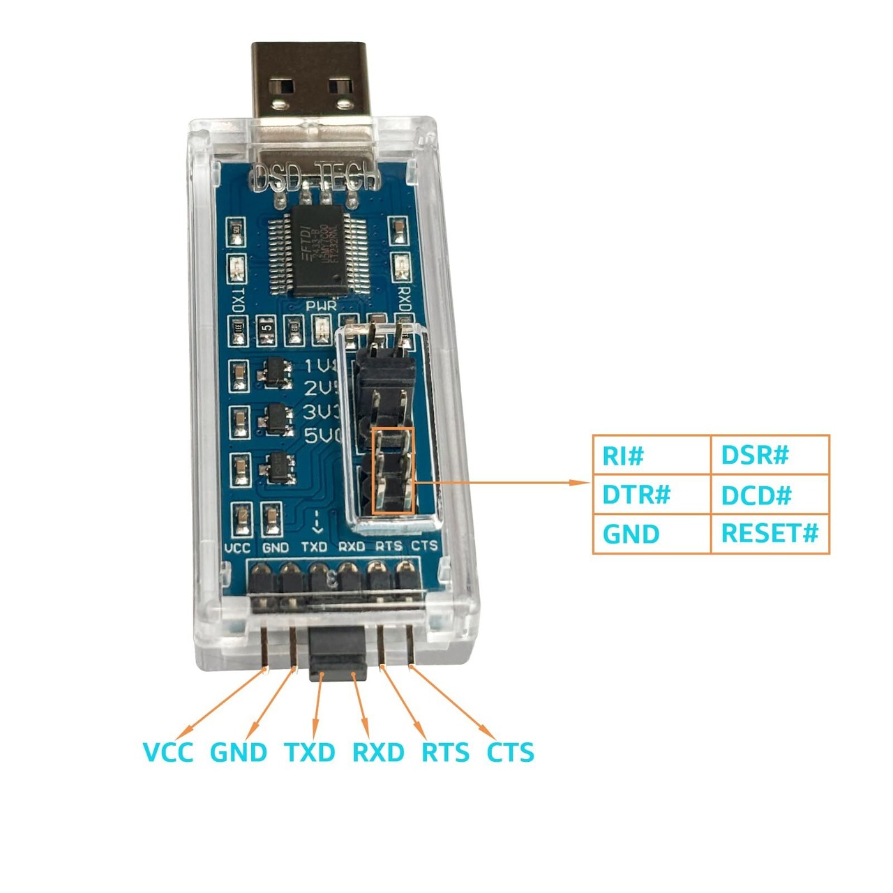 拡張ピン配置を実装:基本ピン(UART TX/RX/RTS/CTS/VCC/GND)に加え、DSR/R1/DCD/DTR/RESETピンにも個別アクセス可能。多様な制御ニーズに対応します。