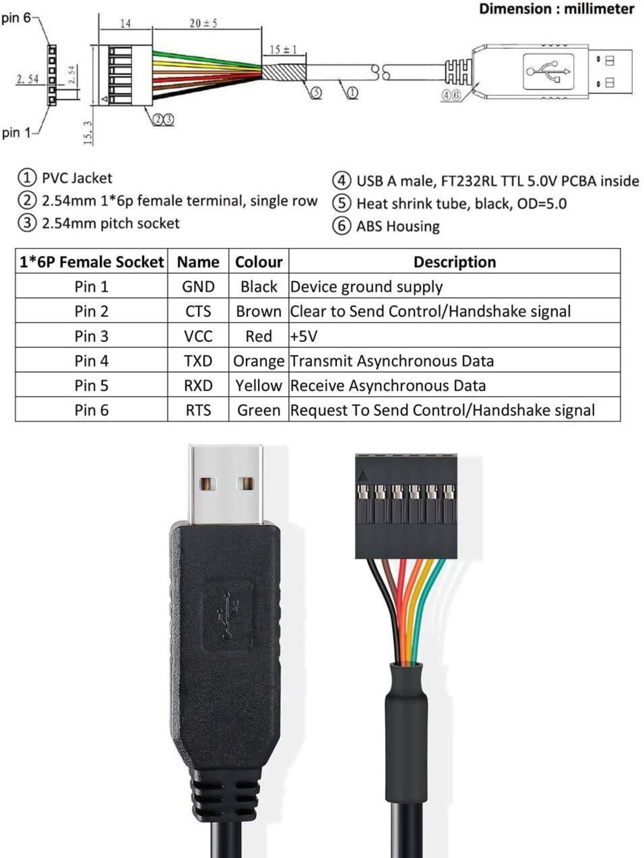 DTECH USB TTL シリアル 変換 ケーブル 5V 1m FTDI チップセット 6ピン 2.54mm ピッチ メス コネクタ FT232RL USB UART シリアル コンバーター ケーブル Windows 10 8 7 Linux Mac