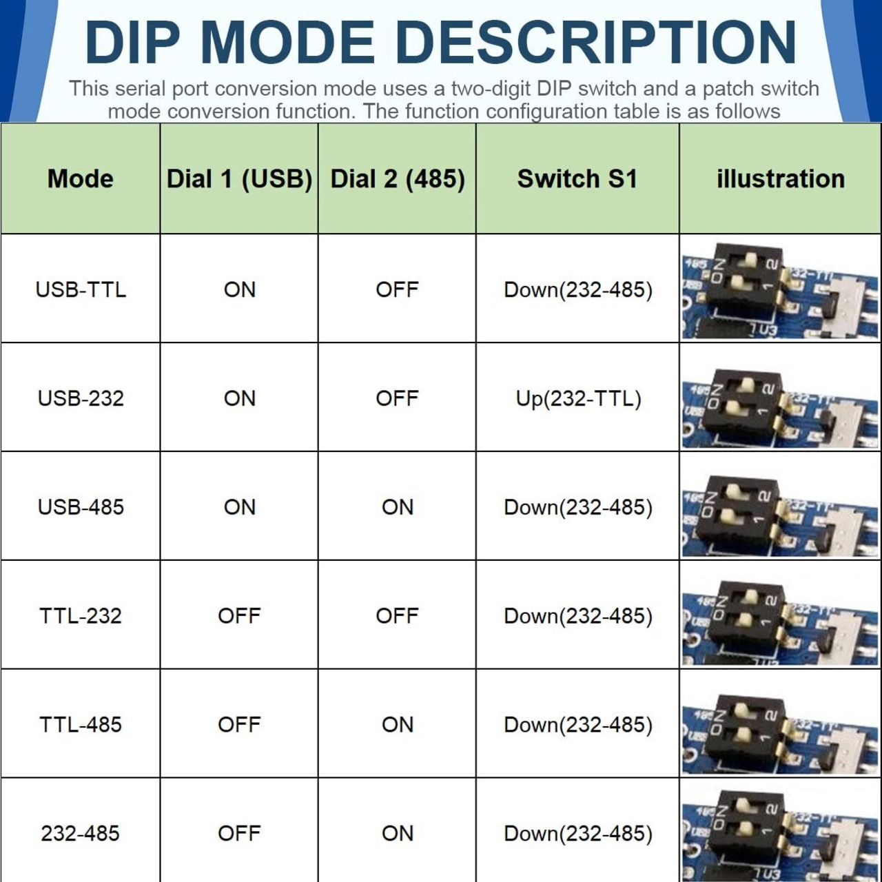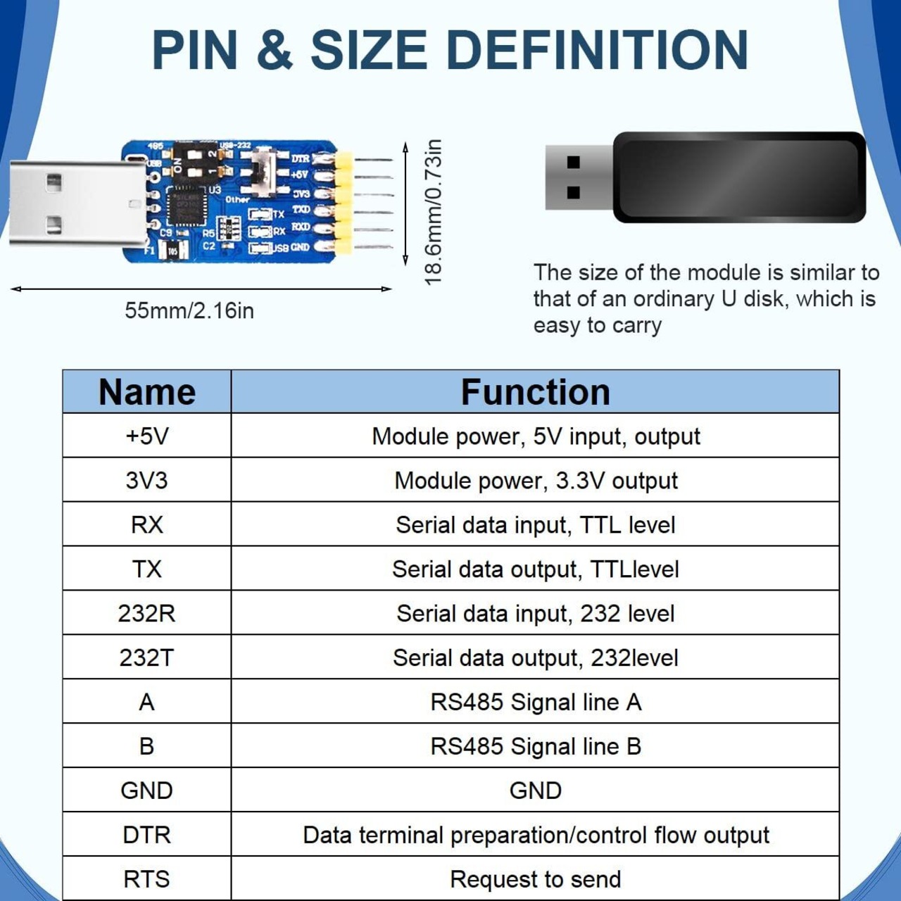 モジュールインターフェース: USBからTTLコンバータモジュールは5Vと3.3Vで動作し、USBからTTL、USBからRS232、USBからRS485、TTLから232、TTLから485、232から485をサポートします。