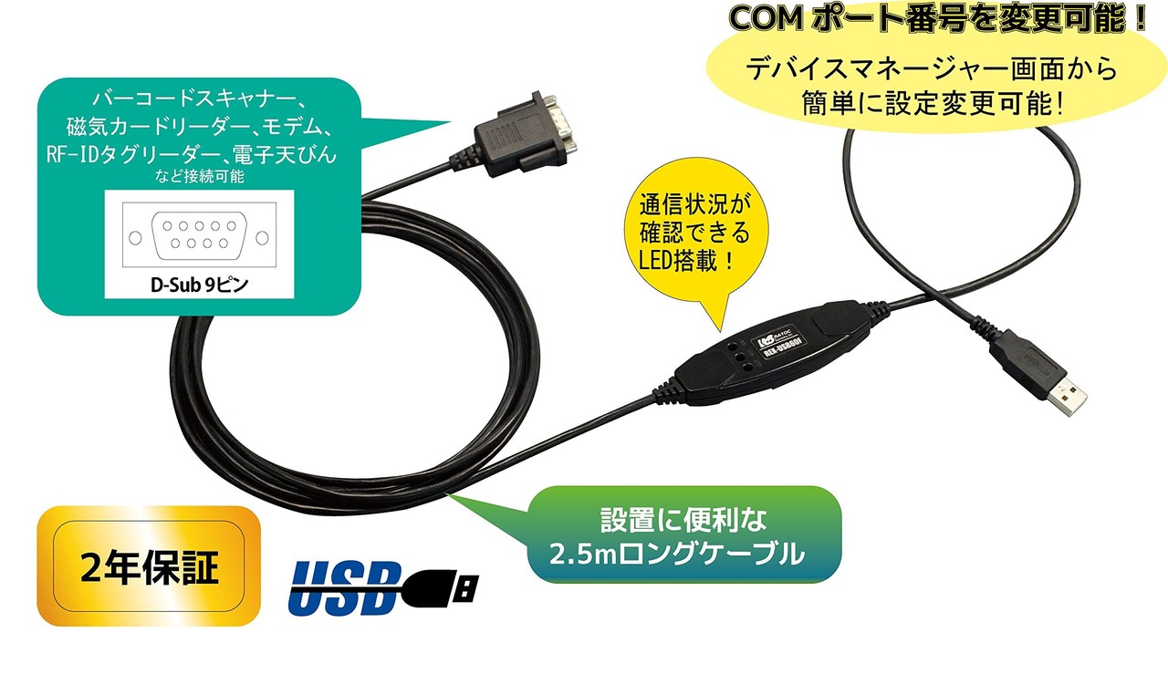 RS-232Cポートをもたないパソコンでも本製品をUSBポートに接続するだけで、RS-232C機器が使用可能に。バーコードスキャナー、磁気カードリーダー、モデム、RF-IDタグリーダー、電源装置などを接続可能。POSシステム組み込み用途などで生じるRS-232Cポート不足はUSBで解消。USBバスパワーで動作するので、ACアダプターなどの外部電源は不要。コネクタはD-Sub 9ピン(オス)を採用。 添付のオリジナルドライバーにより、仮想的にCOM(RS-232C)ポートとして認識されます。パソコンのIRQリソースは占有せず、空いているCOMポートに仮想COMポートとしてアサインされます。また、COMポート番号は、デバイスマネージャーより変更可能。仮想COMポートとして認識されるため、RS-232Cデバイスメーカー各社が提供するCOMポート用アプリケーションがそのまま使用可能。電源はUSBポートからのバスパワーを使用。USB バスから正常に5V 供給が行われていればPOWER LED が点灯します。REX-USB60F本体にはPOWER LEDのほか、送信・受信LED を搭載。 データの流れを簡単にモニターすることができます。Windows とMacOSの両プラットホームに対応。USBポートを装備したWindowsサーバにもRS-232Cデバイスを接続可能。