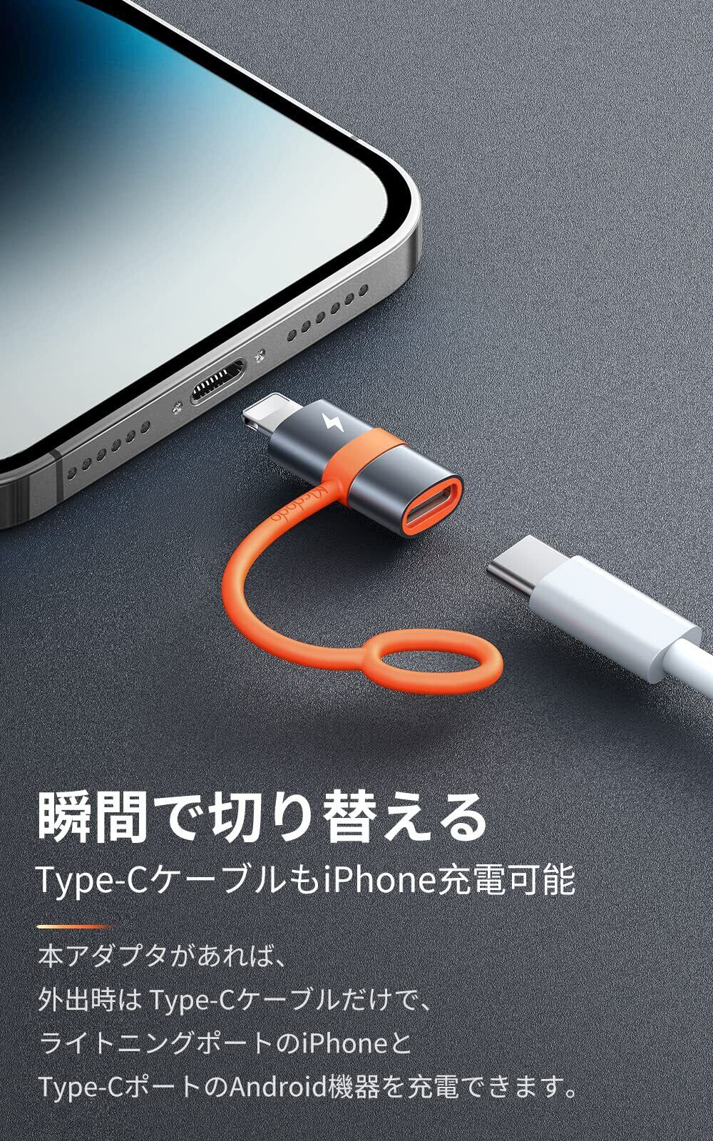 【Type-C to ライトニング 変換アダプタ】:瞬間で切り替えて、Type-CケーブルもiPhone充電可能です。本アダプタがあれば、外出時はUSB-Cケーブルだけで、ライトニングポートのiPhone 14/13/12/11/XS/XR/SE/8・iPad・iPodなどiOS機器を急速充電できます。