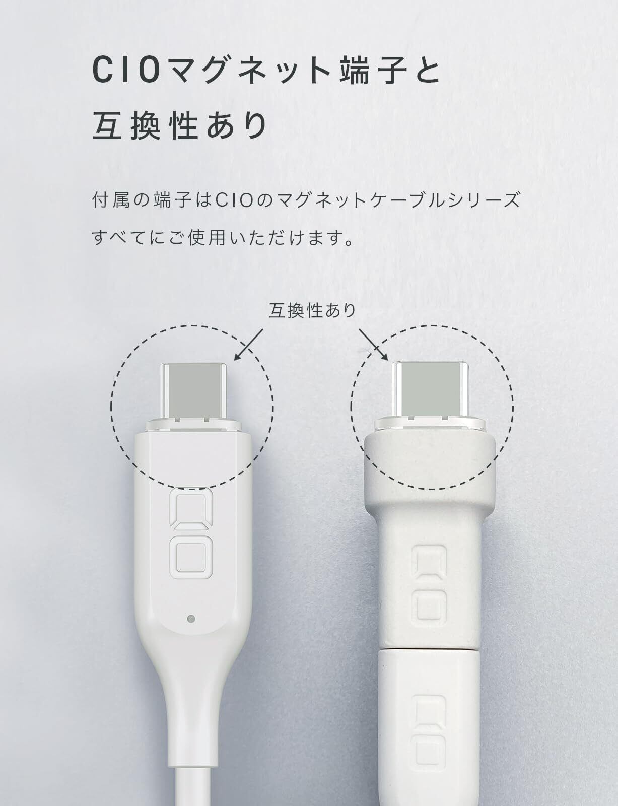 【お手持ちのケーブルをマグネット化!】CIOマグネット変換アダプタは、お手持ちのUSB type-Cケーブルを便利なマグネットケーブルに早変わりさせるコンバージョンパーツです。CIOマグネットケーブルの端子と互換性がありますので、マグネットケーブルに差し替えて余ったケーブルをマグネット化させるなど、幅広くご活用いただくことが可能です。