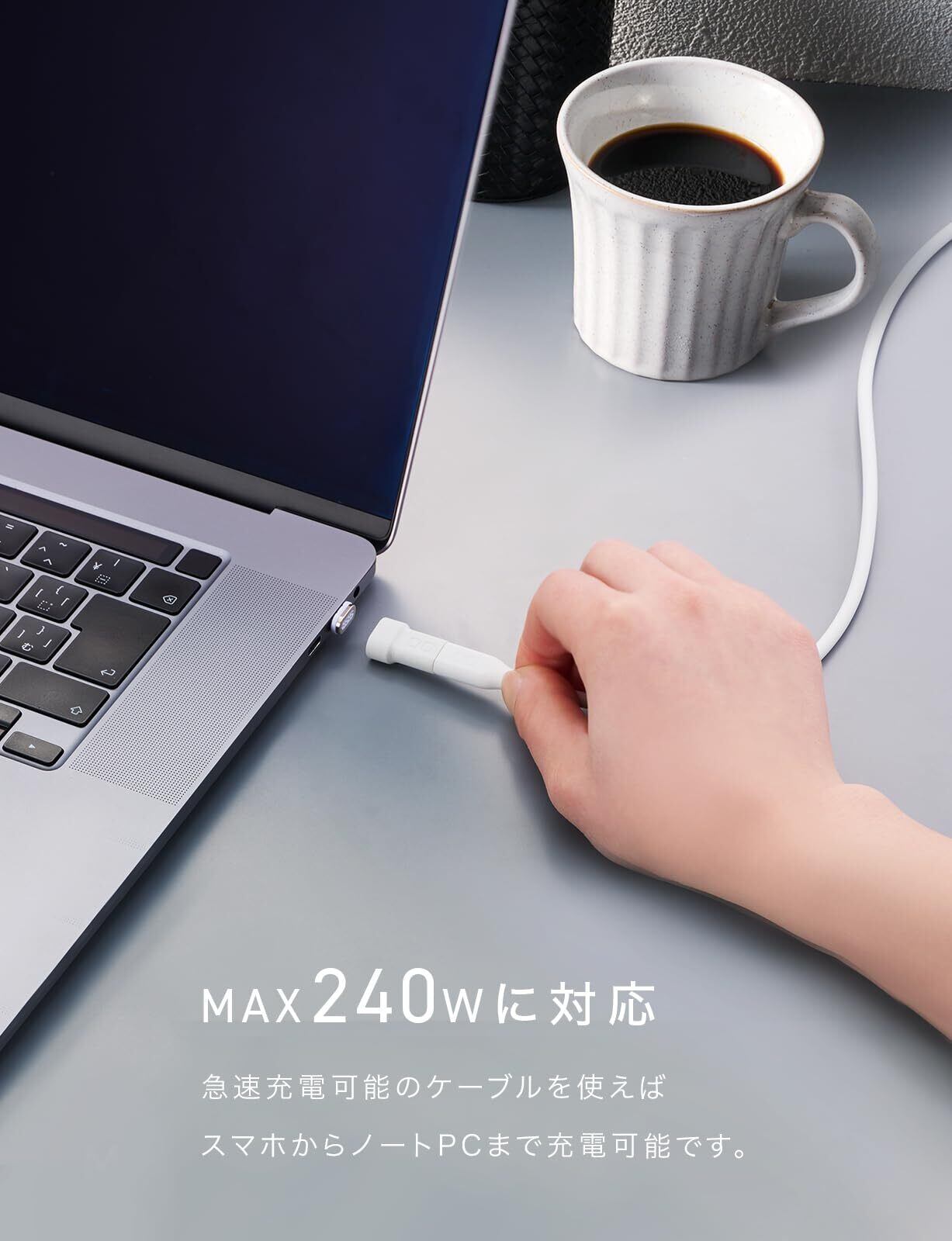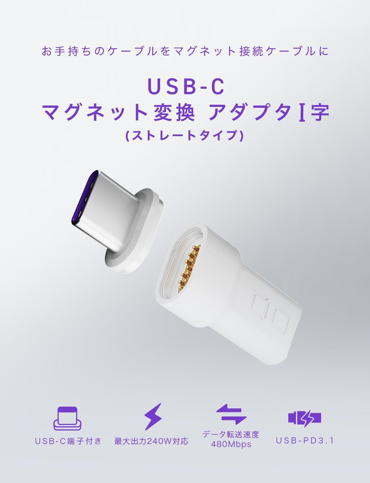 ※マグネット変換アダプタは映像出力には非対応となっております。※e-Marker非搭載ですが、e-Marker内蔵のケーブルと組み合わせてご使用いただくことでe-Markerを認識し、最適電力調整に対応いたします。※仕様として最大240Wの出力に対応しておりますが、接続するケーブルの対応出力に準じた出力が上限となります。※急速充電に対応(USB-PD3.1)しておりますが、データ転送は上限最大480Mbps、USB2.0規格となります。