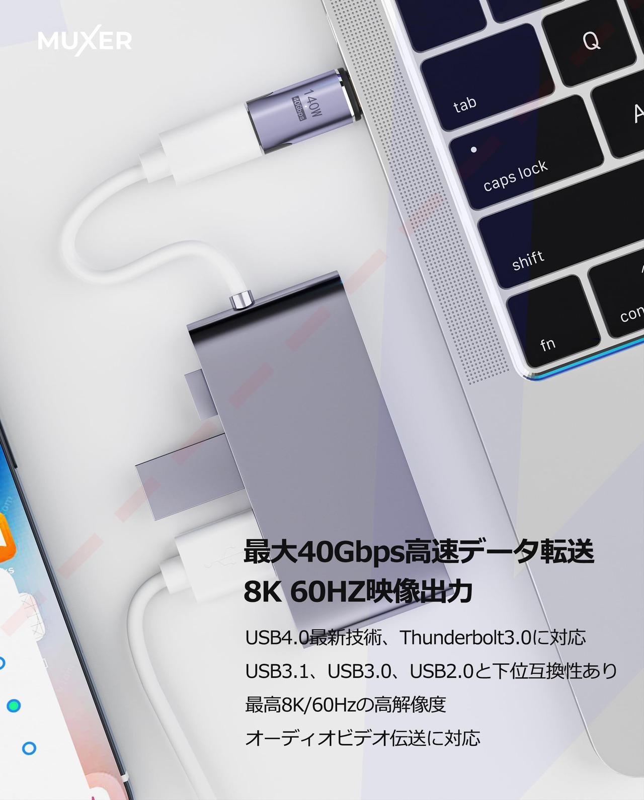 【40Gbpsデータ転送】:USB CアダプタはUSB 4規格に適合し、最大40Gbpsのデータ転送速度があります。映画や音楽などをわずか数秒で転送できます。データ転送速度はUSBデバイスとケーブルのサポートに依存することにご注意ください。