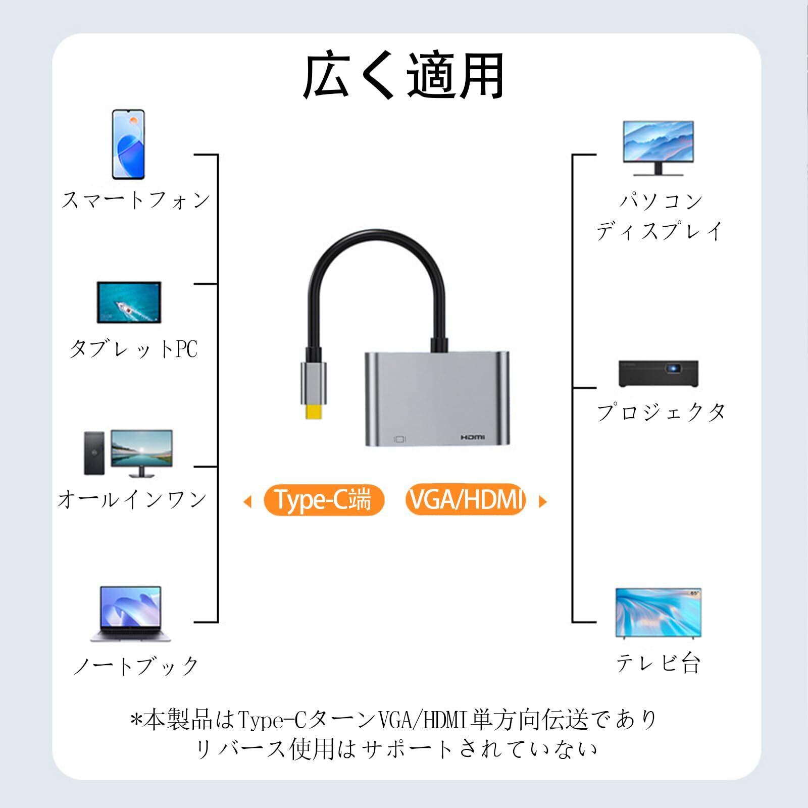【USB Type-C HDMI vga変換アダプタ】PC ノートパソコン の 映像、映画、音声、動画、写真をTV テレビやモニター、プロジェクター などの外部 ディスプレイに出力するためのUSB Type-C HDMI変換アダプタです。ディスプレイモードと拡張モードなどが行います。動画、プレゼン、会議、ゲームに大活用大便利になる。当商品がusb typec hdmi vga変換アダプター、パソコンとかネットパソコンなどの入力機器が是非usb typec 端子付きしなければなりませんでした。