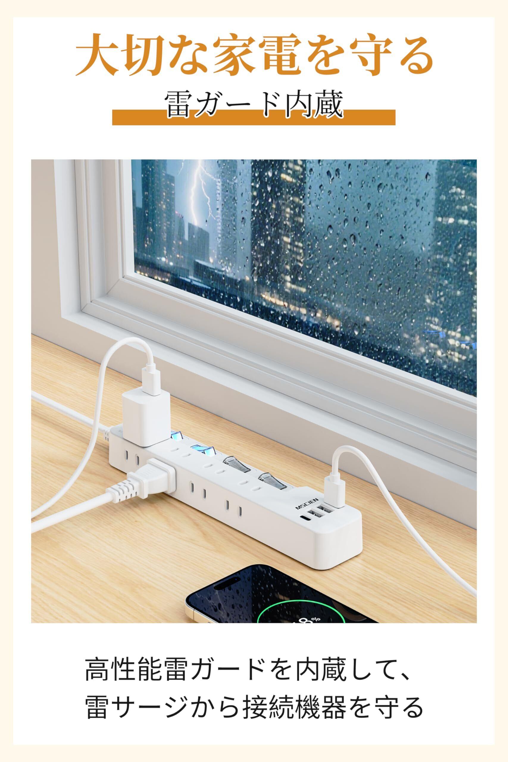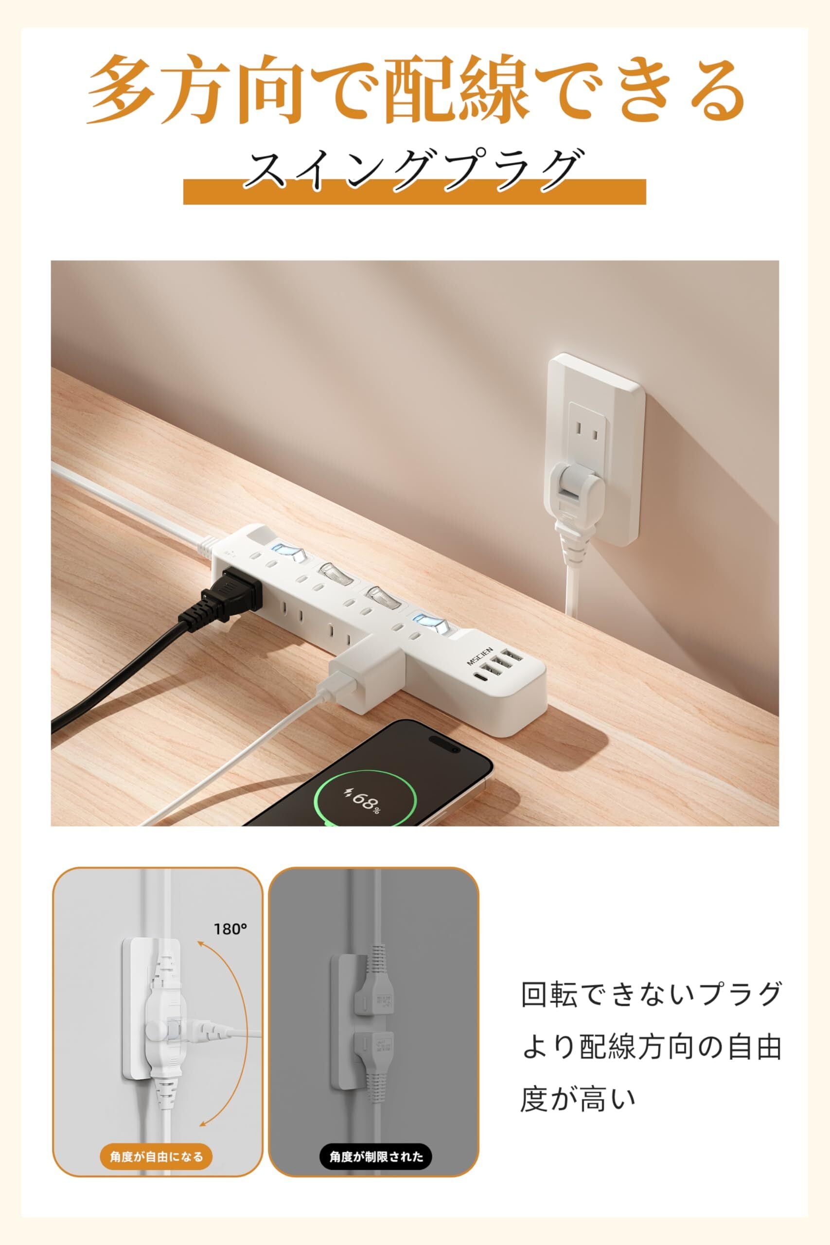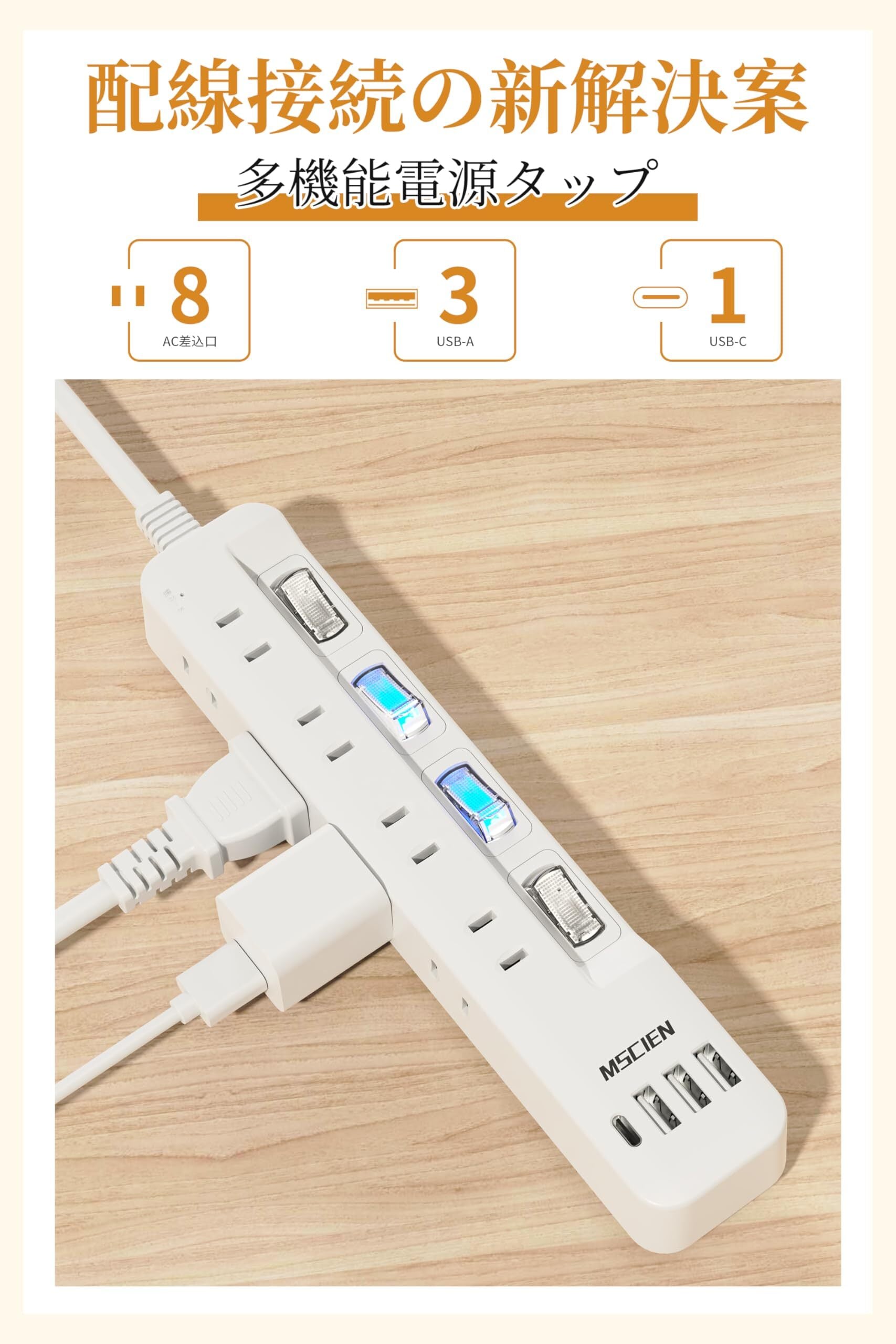 Mscien 電源タップ usb付き 8個AC口 1個usbc 3個usba 延長コード 2m 雷ガード usb コンセント oa スイッチ付き 壁掛け たこあしコンセント テーブル マルチタップ スイングプラグ おしゃれ (2M)