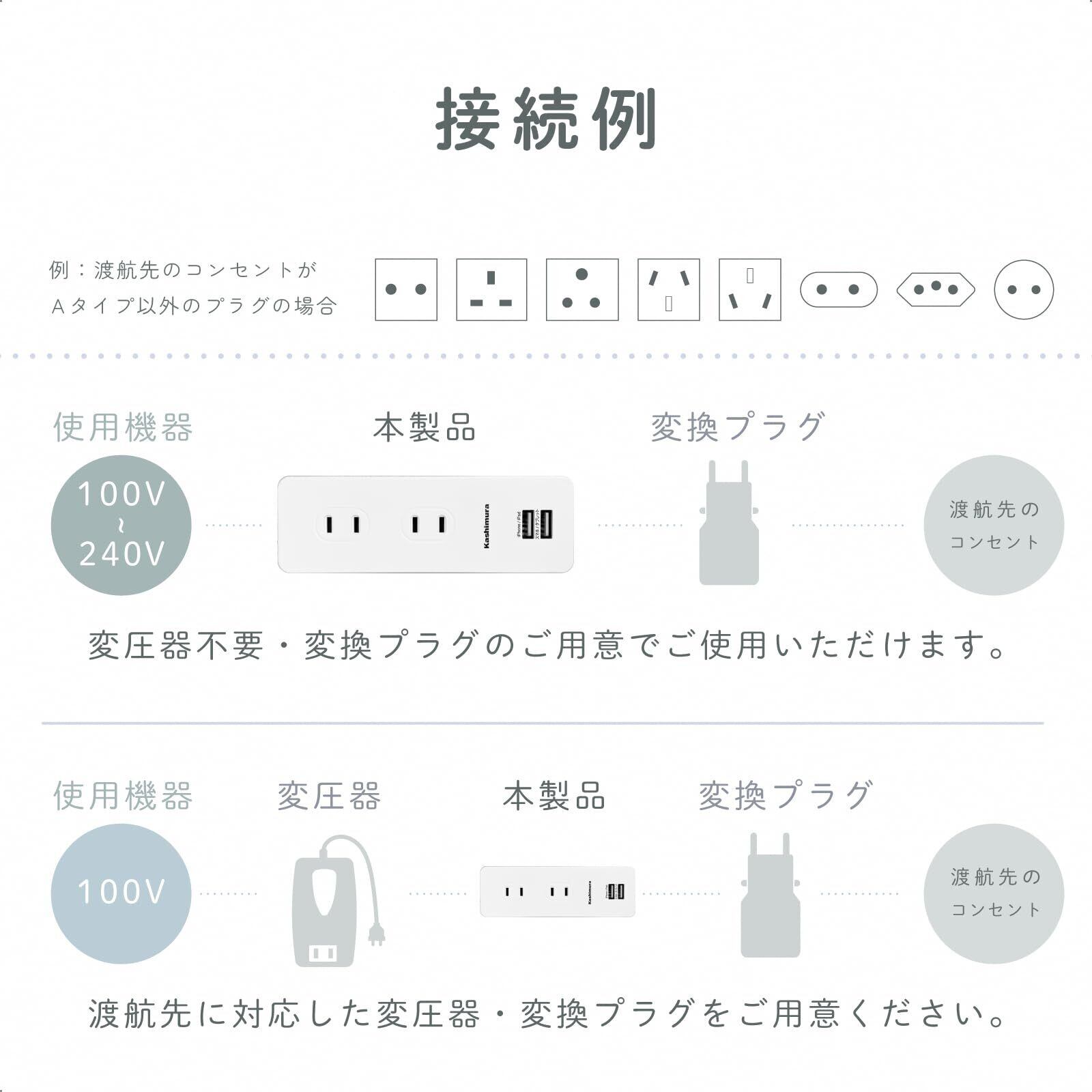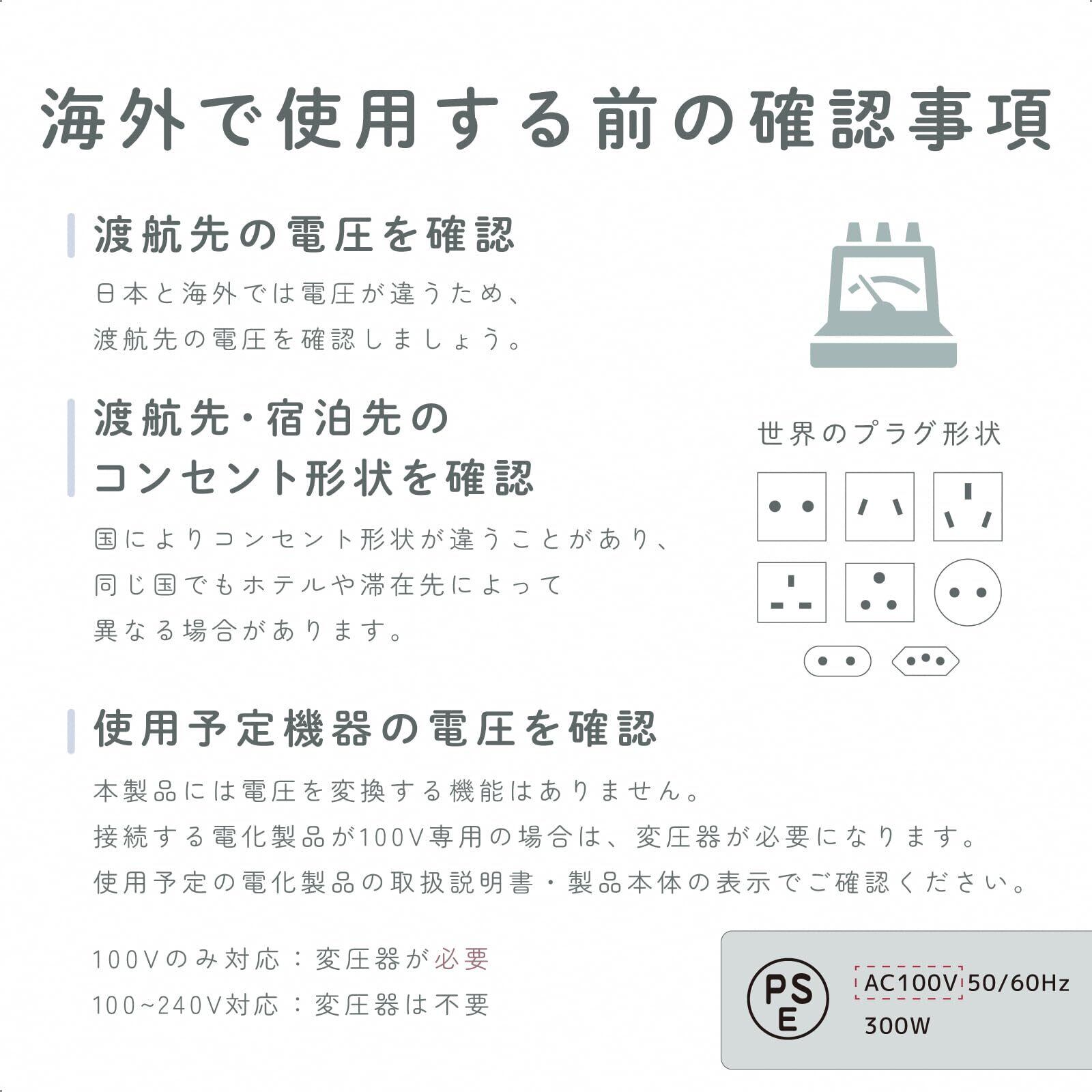 ・本製品は変圧器ではありません。海外でご使用の場合、現地の電圧に対応している電気製品を接続するか、別途変圧器をご使用ください。