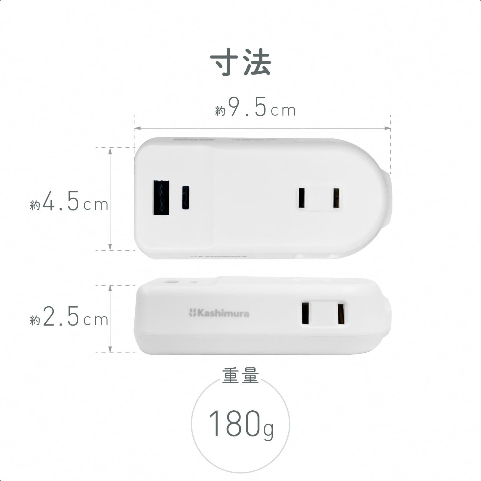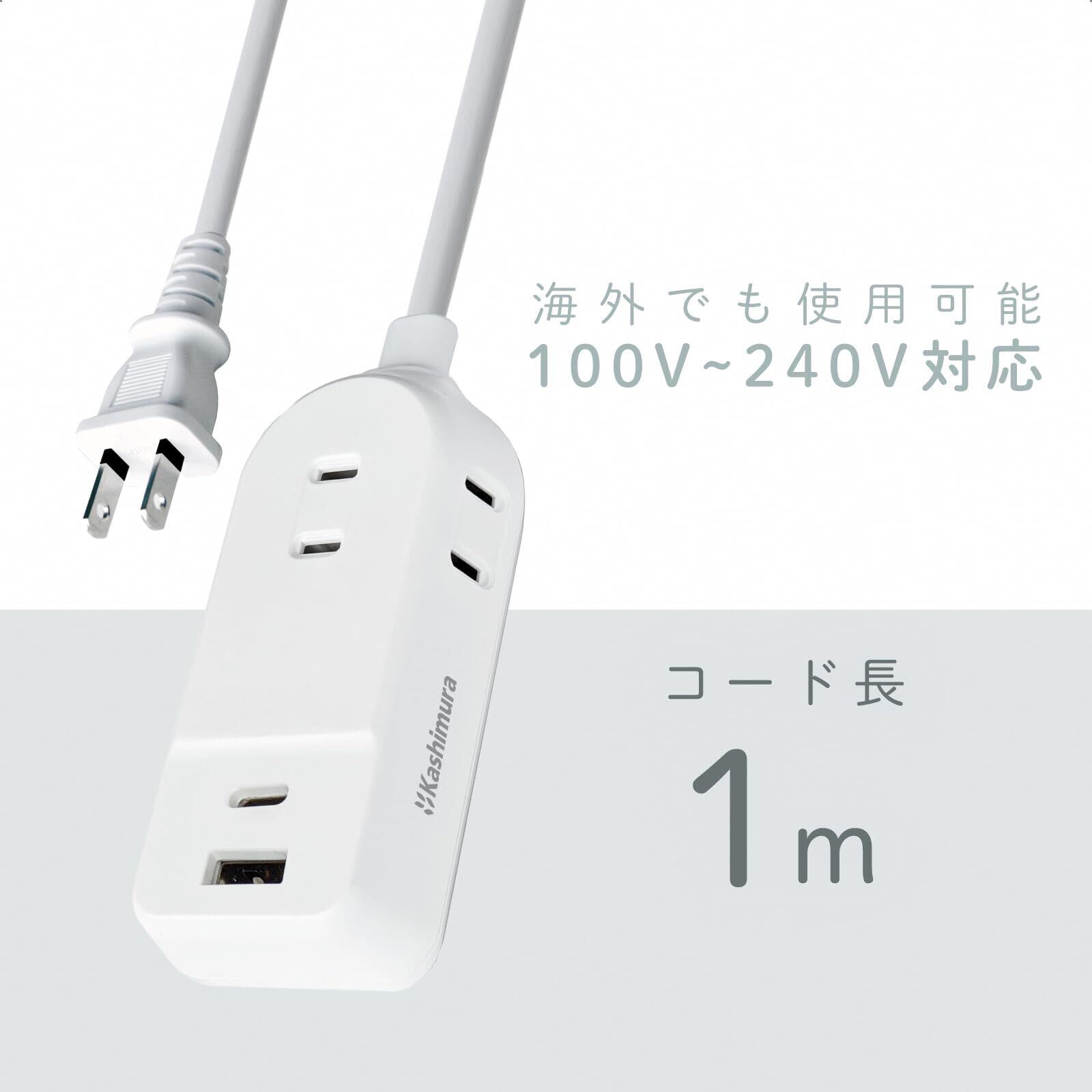 カシムラ 国内・海外両用電源タップ 100~240V入力対応 コード1m AC3 A/C 2P 2.4A 【ACコンセント3口合計1400W / USB2ポート 合計最大出力12W(5V2.4A) USB-A×1 USB Type-C×1】 NWM-19