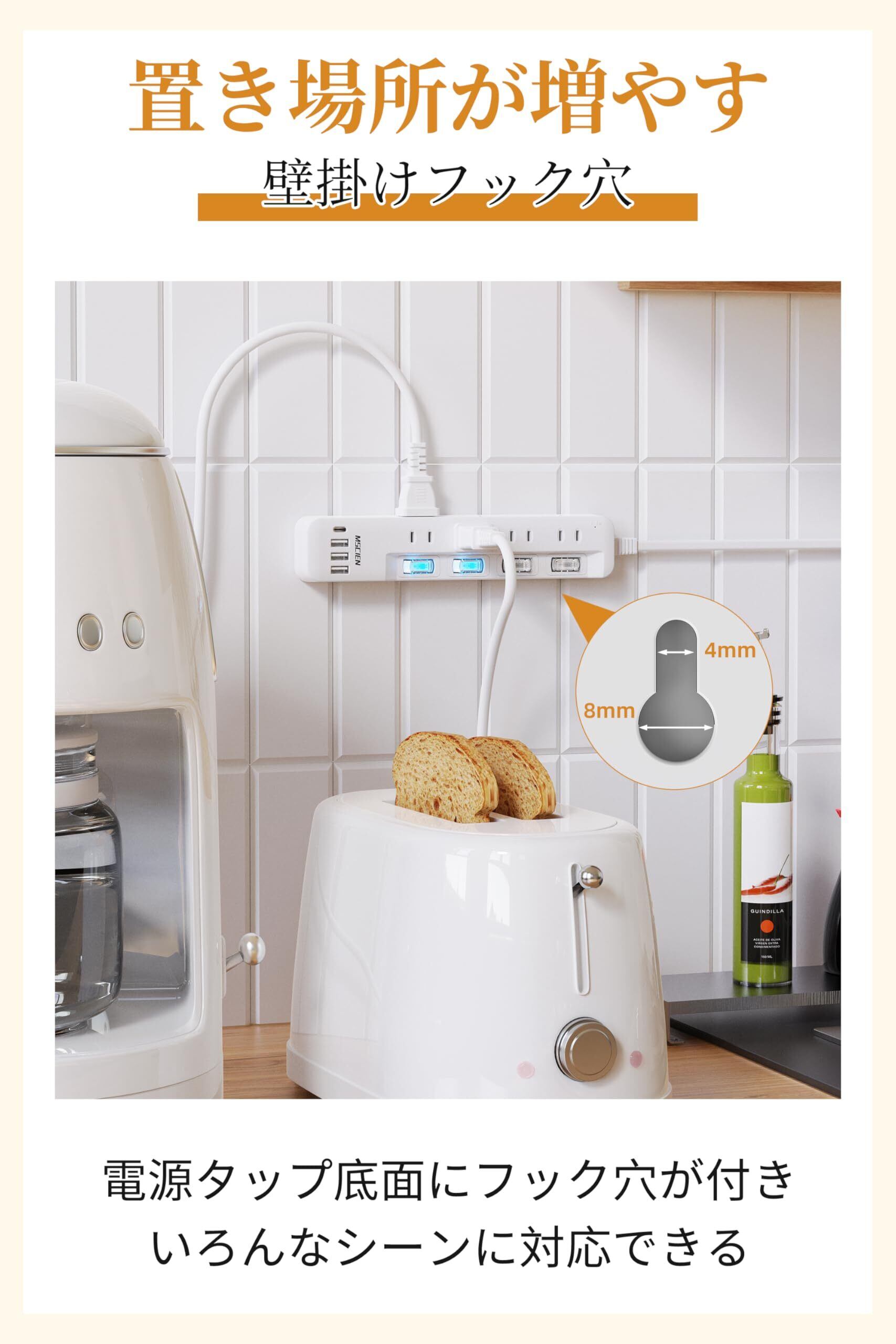 【壁掛けタップ・テーブルタップ】電源タップにはフック穴が付いており、壁等の場所にしっかり固定することができます。テーブルタップの底に滑り止めが付いており、使用がより安定しています。