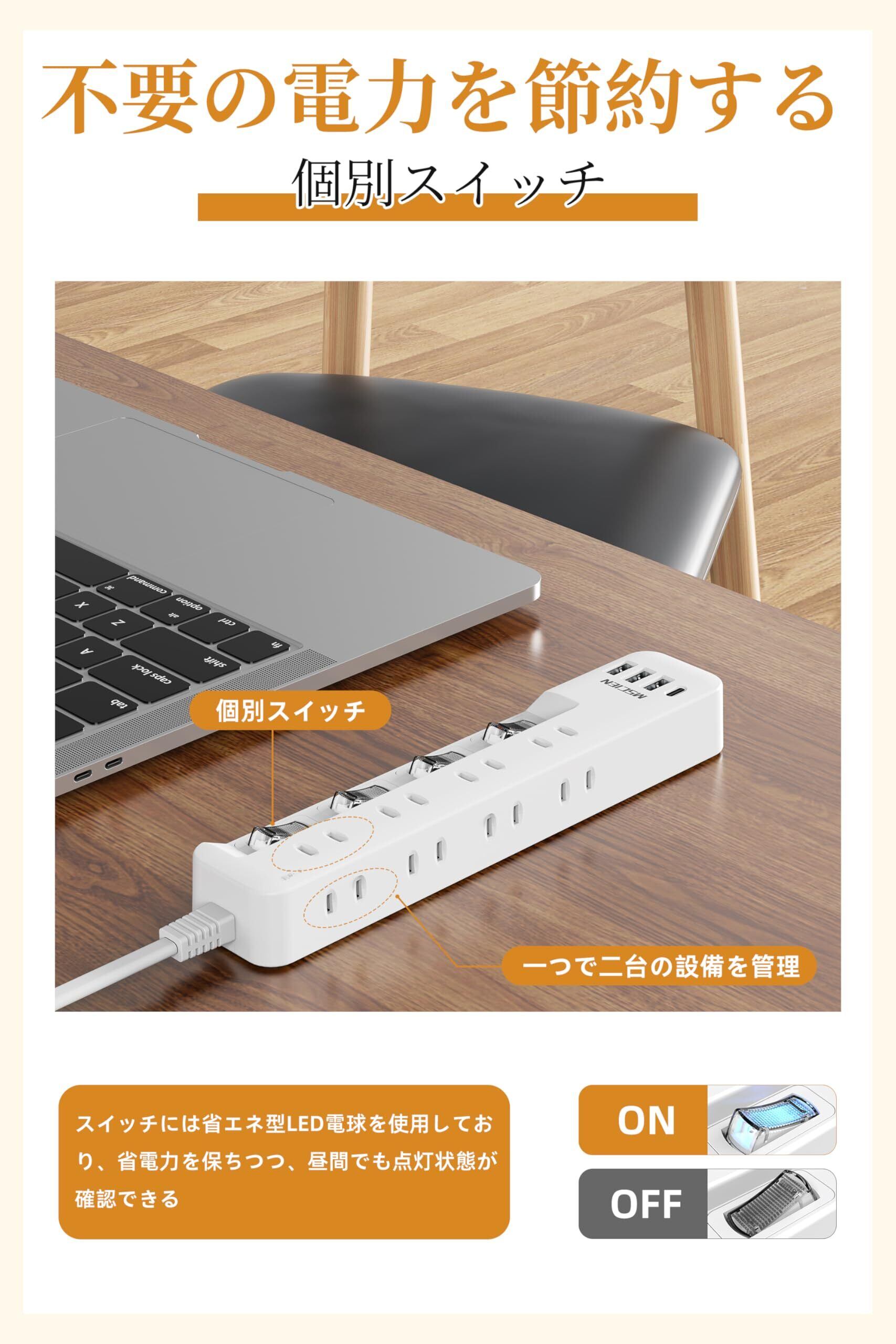 【スイッチ付き・節電・省エネ】コンセントには接続機器のON/OFFができるスイッチが付いており、使わないところは切って電力を節約することができます。スイッチLEDランプが付いており、一目で通電が見えて安心です。(※ご注意:各スイッチは上下2つのAC差込口を制御します。)