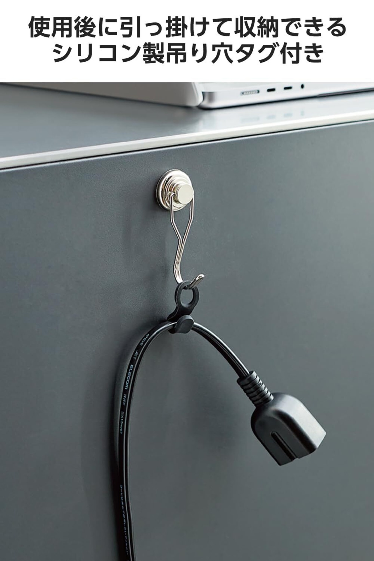 直径10mmのシリコン製吊り穴タグを付属。使用後はフックなどに引っ掛けて収納できます。