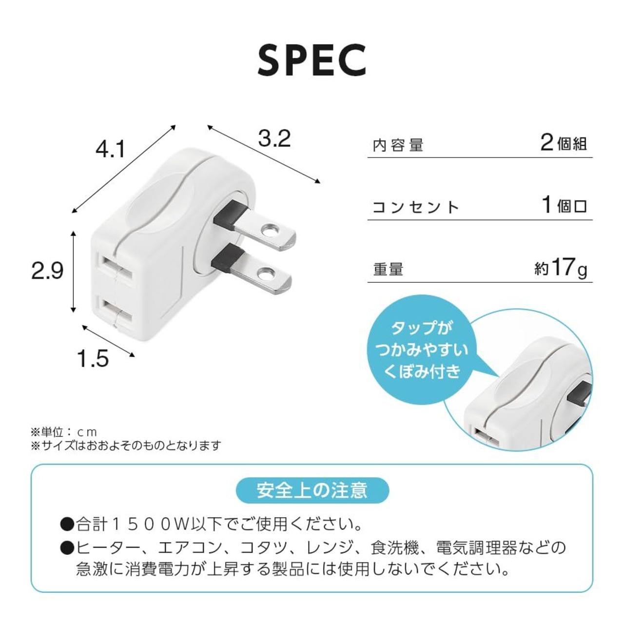【商品仕様】商品サイズ/W29×H41×D15mm、重量/(約)17g(1個あたり)、内容量/2個組、コンセント口数/1口、絶縁カバー/あり、定格入力/125V 15A 合計1500Wまで、製品型番/AY02SA01W