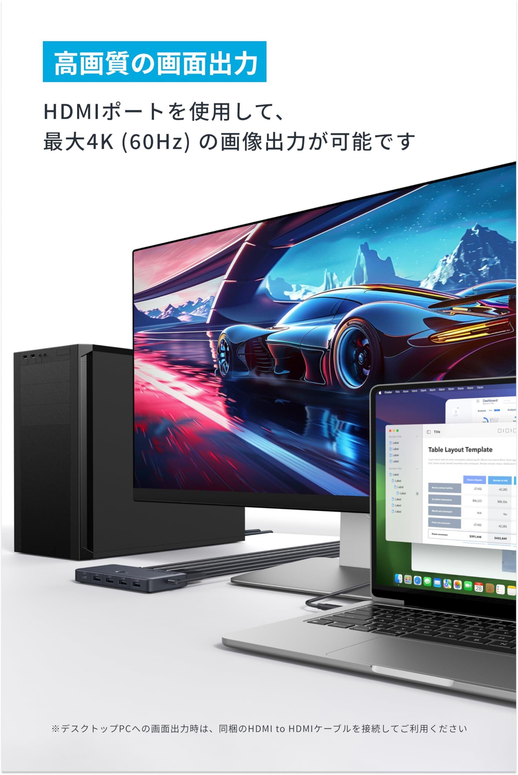 高速データ転送かつ高画質出力:最大5Gbpsでの高速データ転送と最大4K (60Hz) の高解像度での出力を実現しました。