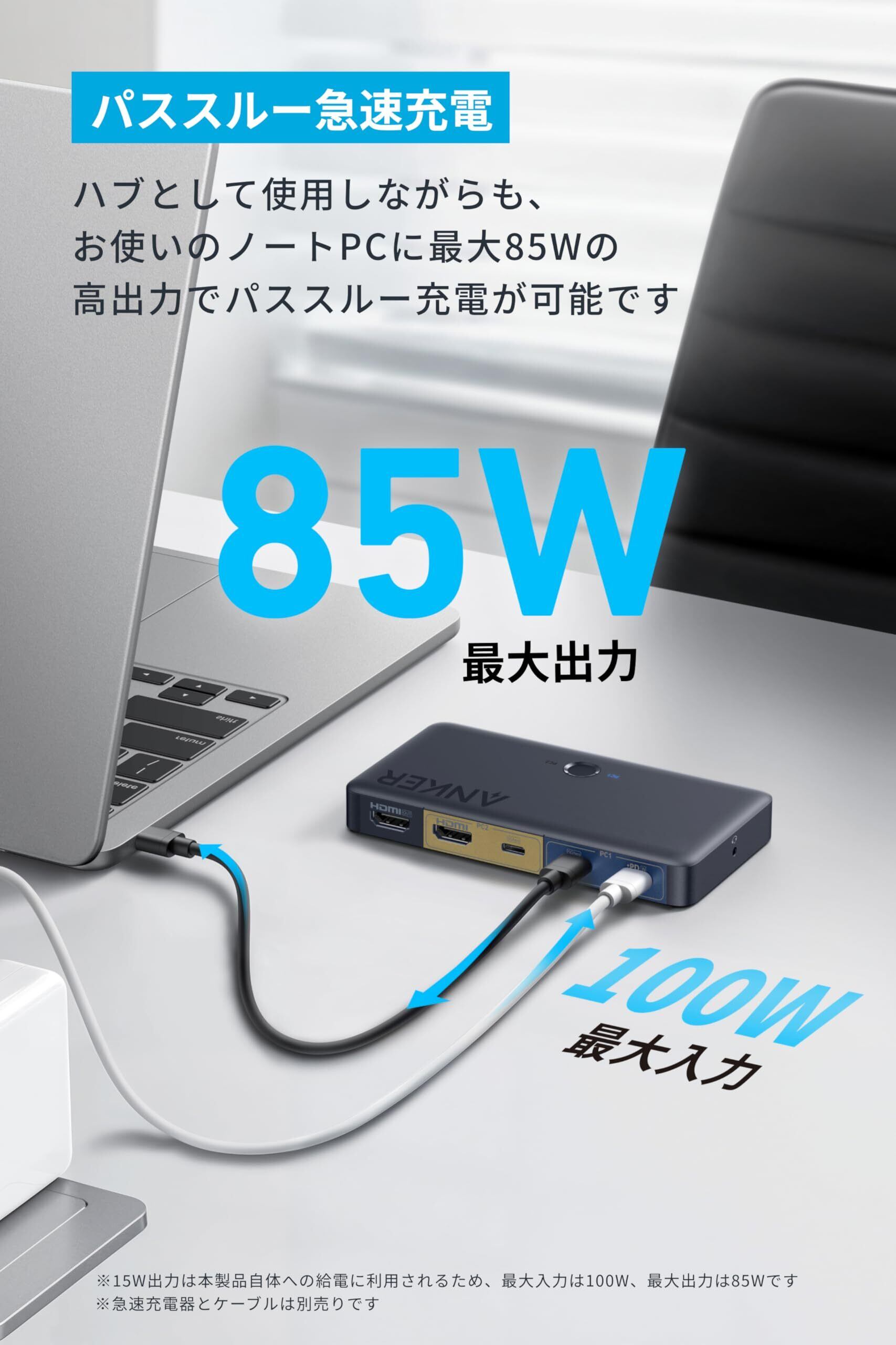 パススルー急速充電:データ転送やHDMI接続などKVM Switchとして使用しながらも、お使いのノートPCに最大85Wまでの高出力でパススルー急速充電が可能です。(※85Wでのパススルー急速充電を行うためには、100Wの出力に対応した急速充電器とケーブルをお使いください。なお、急速充電器とケーブルは別売りです。)
