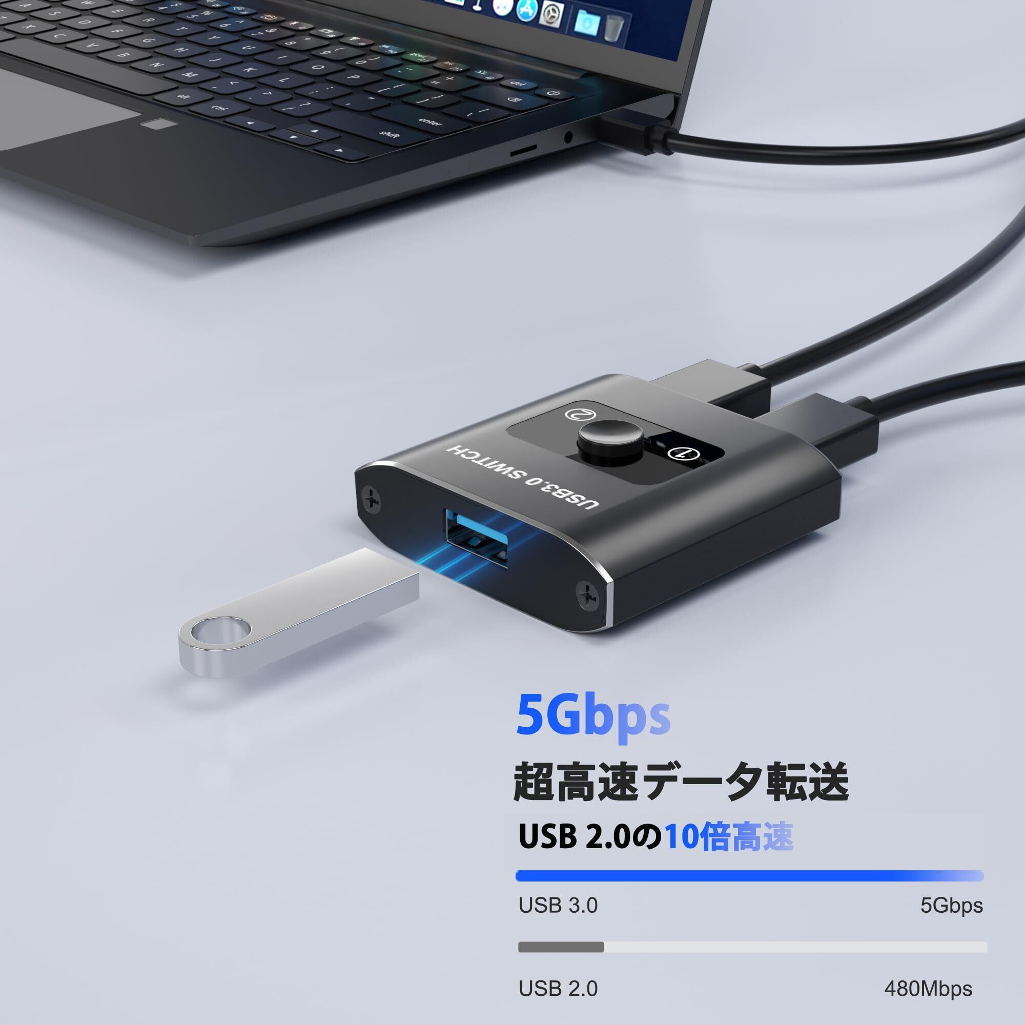 【USB 切替器 双方向切り替え】このUSB3.0切替器は、2台のパソコンで1台のUSB機器を共有し、2台のUSB機器で1台のパソコンを共有することができます。また、プリンターやスキャナーだけでなく、外付けHDDやUSBメモリーをUSB切替器で切り替えることもできます。2台のPCでデータを共有したいとき、わざわざケーブルをつなぎ直すことも、ネットワーク上にアップする必要もなくなるため、大幅な作業効率の向上と時間短縮が図れるです。ご注意:1対1なので、二つのUSB機器が同時入力/出力不可です。