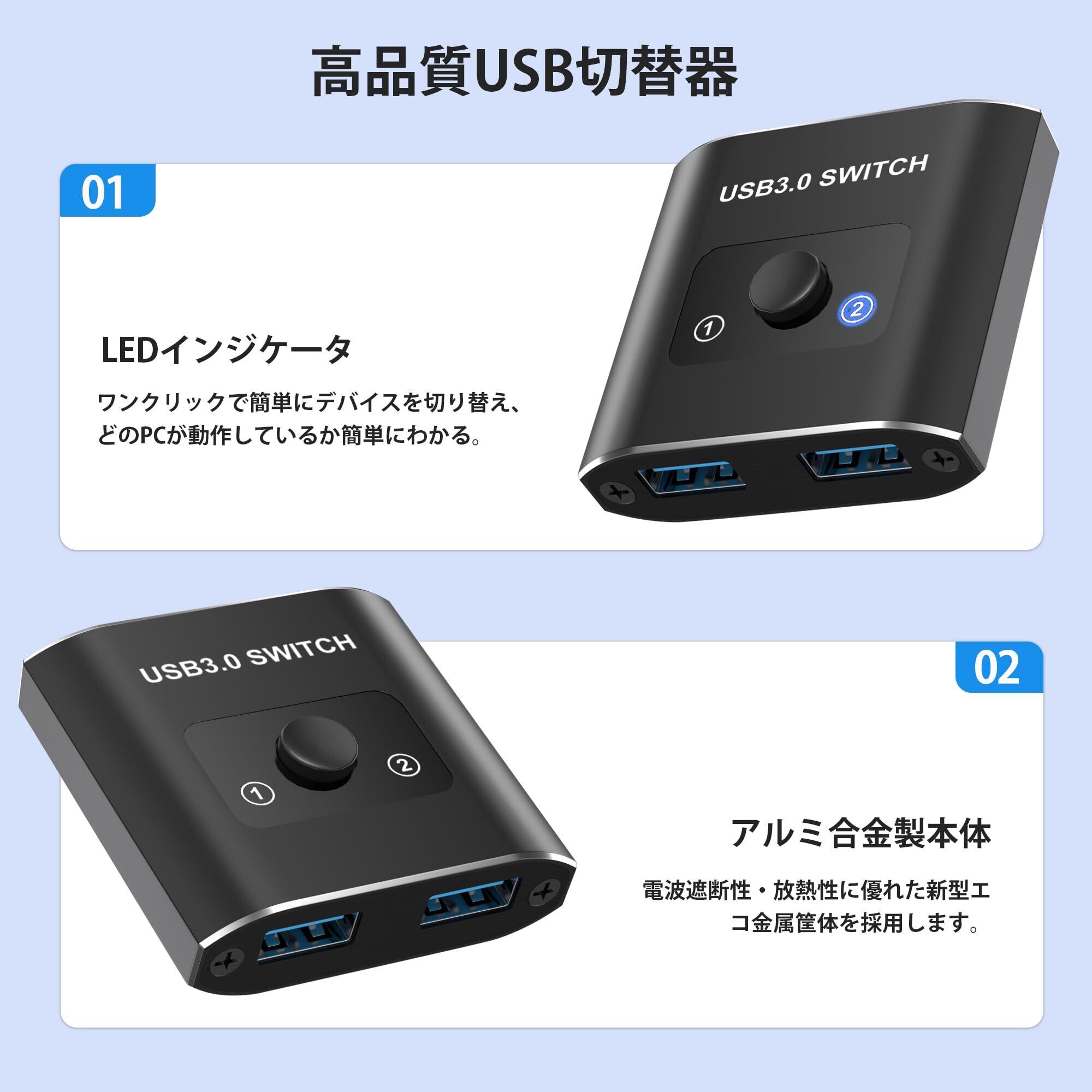 USB 切替器 USB3.0 双方向 切り替え器 2入力1出力/1入力2出力 PC2台用 1台のプリンターを2台のパソコンで使用 マウス キーボード 切り替え器 セレクター パソコン 2台 キーボード 1台 Type-Aスイッチャー 2本のType-A3.0ケーブル付き