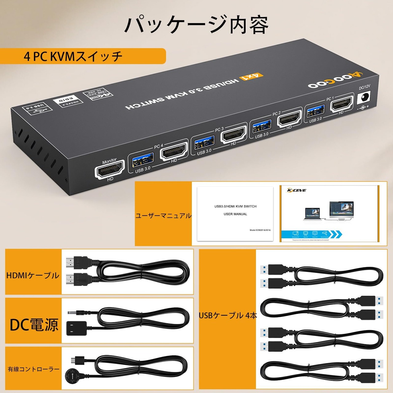 USB 3.0 KVM スイッチ HDMI 4 PC 4K@60Hz EDID 付き 4入力1出力、キーボード、マウス、プリンター、コントローラー用の4つのUSB 3.0ポート、USB3.0ケーブル、HDMIケーブル付属