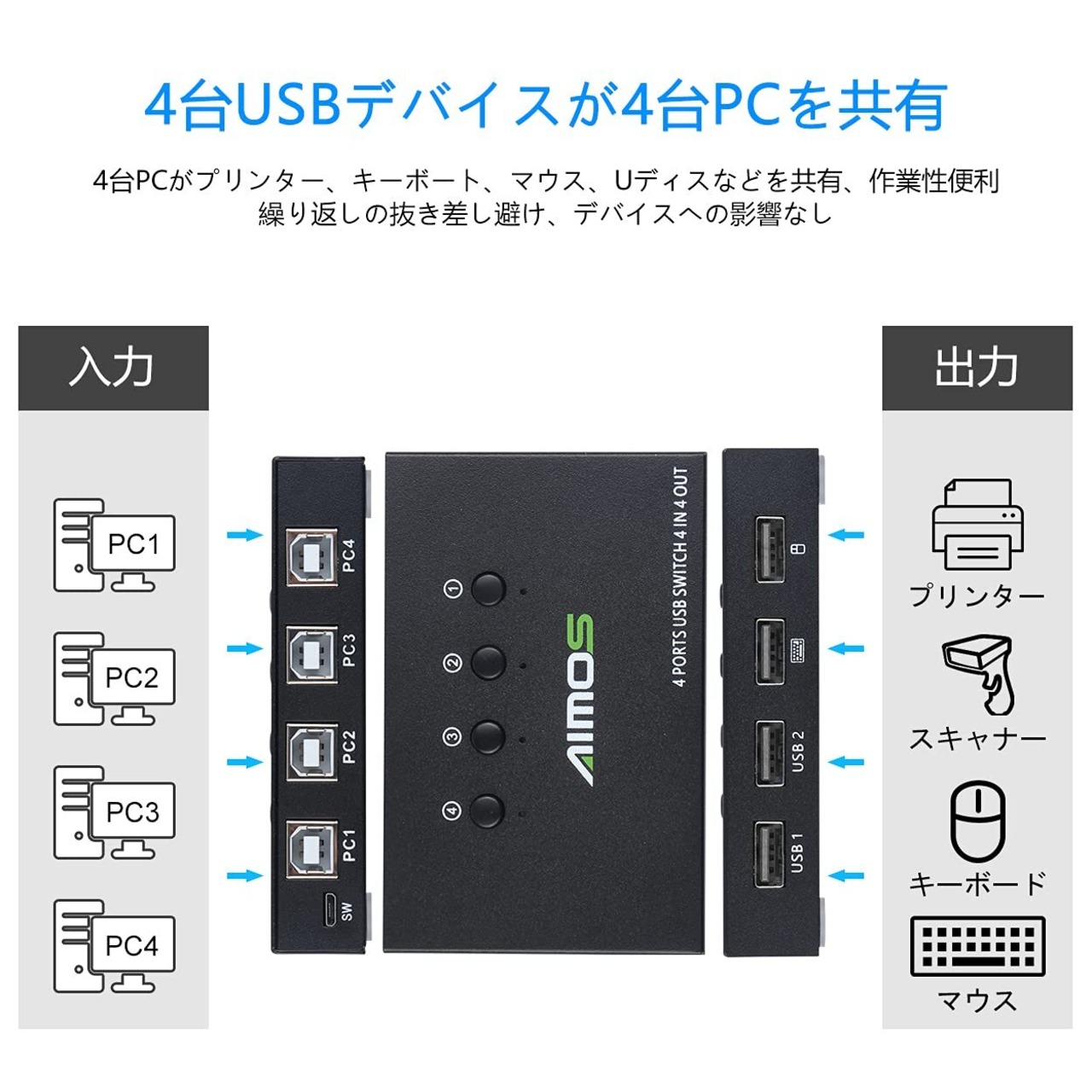 AIMOS USB切替器、4入力4出力USB切り替え+ハブ、4台PC共有マウス、キーボード、スキャナー、プリンター、Uディスク、ハードディスクなど4本のUSBケーブル