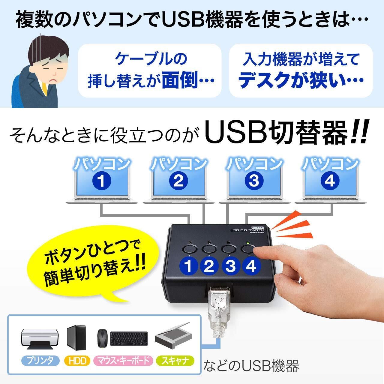 4台のパソコンで1台のUSB機器を共有できるUSB切替器です。ボタン一つで簡単に切り替えることができます。