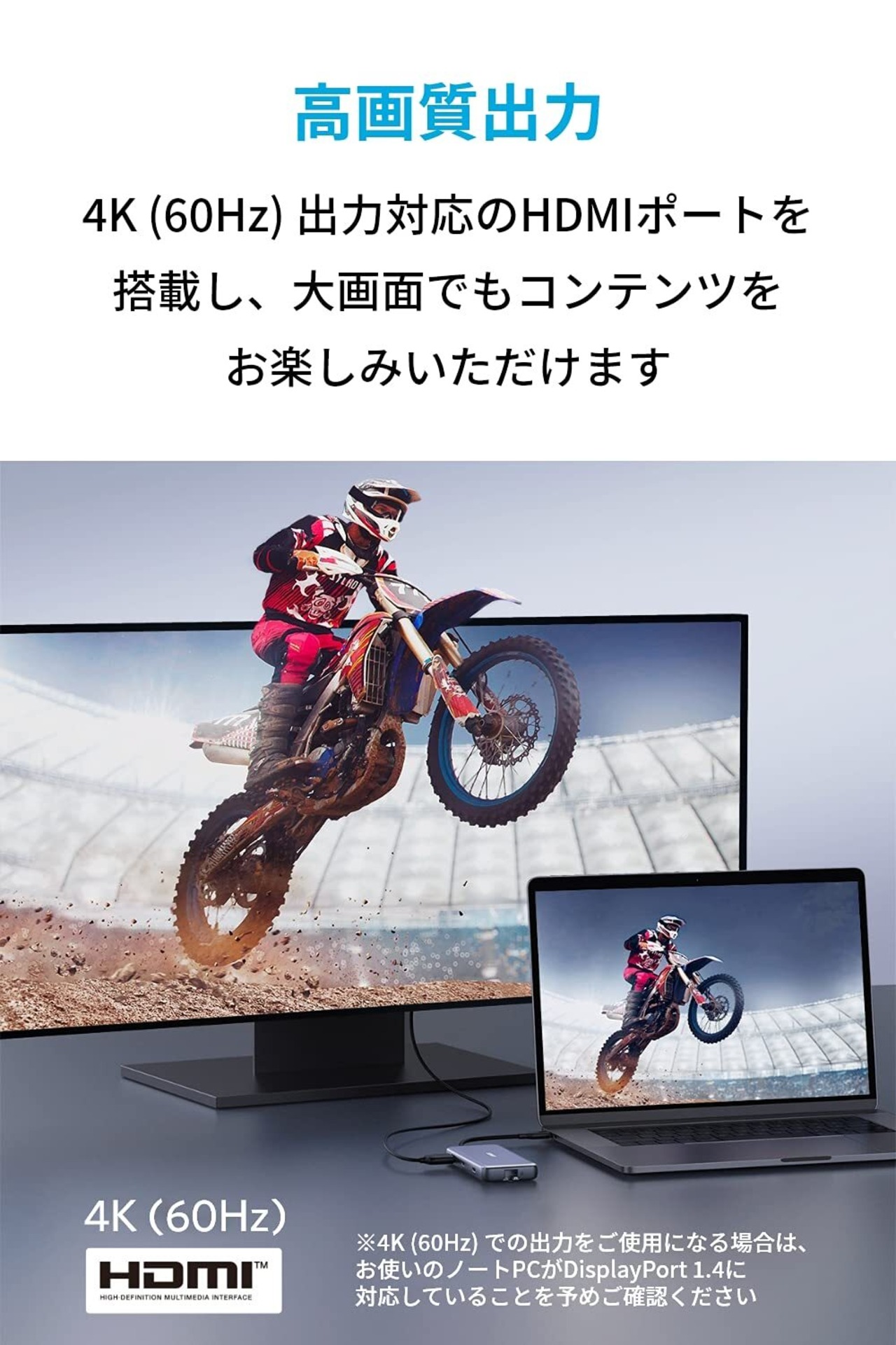 高速データ転送・高画質出力:データ転送用USB 3.1 Gen 2対応のUSB-C ポート、2つのUSB-A ポートから最大10Gbpsでの高速データ転送を実現。さらに、HDMIポートから4K (60Hz) での高画質出力が可能です。※4K (60Hz) での出力をご使用になる場合は、お使いのノートPCがDisplayPort 1.4に対応していることを予めご確認ください。