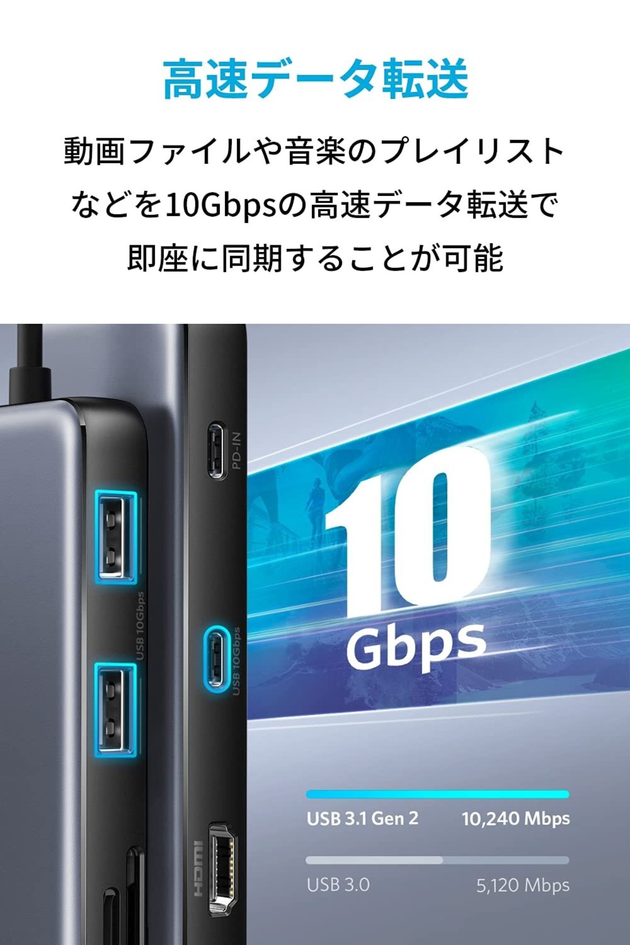 Anker PowerExpand 8-in-1 USB-C PD 10Gbps データ ハブ 100W USB Power Delivery 対応 USB-Cポート 4K (60Hz) 出力対応 HDMIポート 10Gbps 高速データ転送 USB-Cポート USB-Aポート 1Gbps イーサネット microSD&SDカード スロット搭載 MacBook Pro iPad Pro対応
