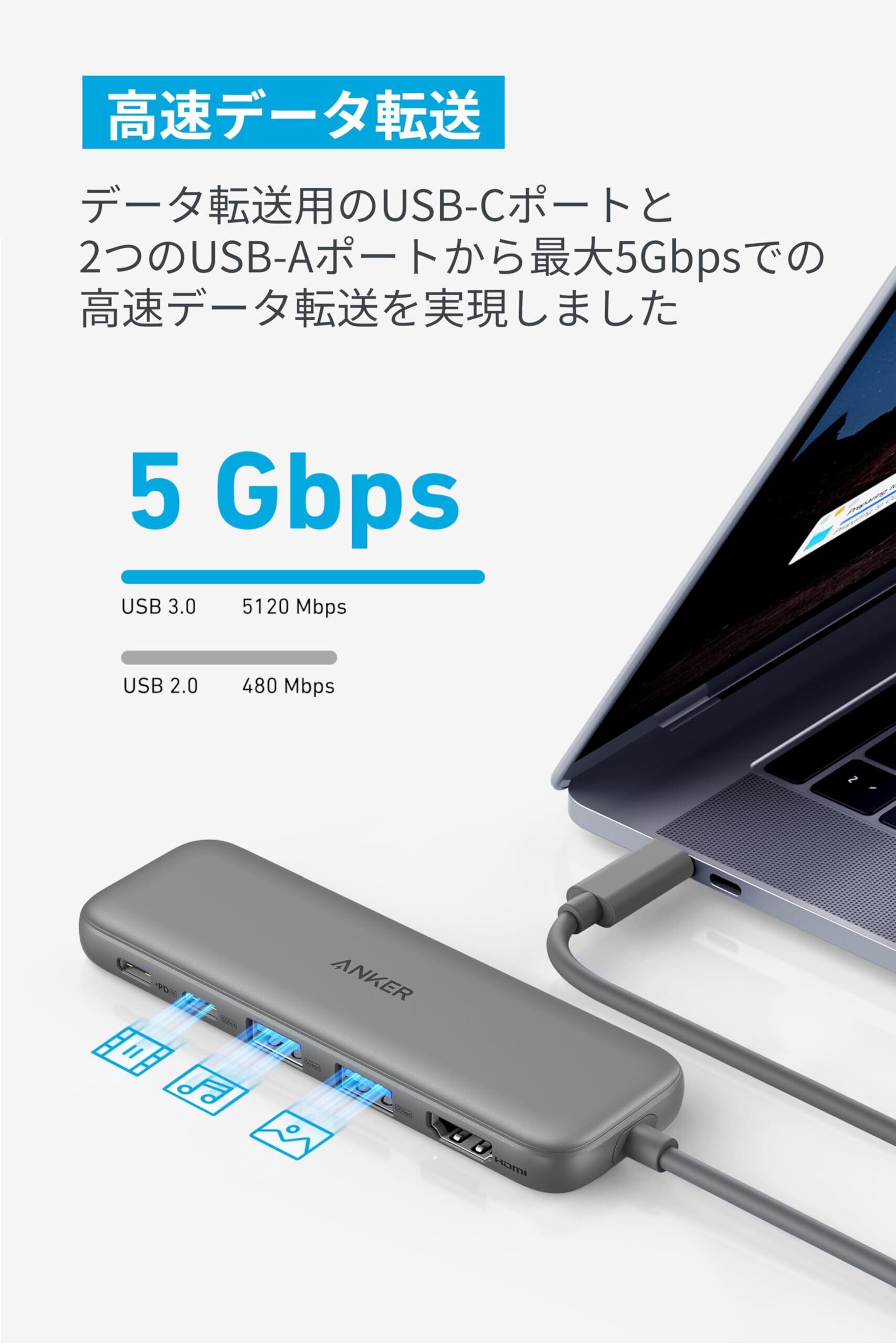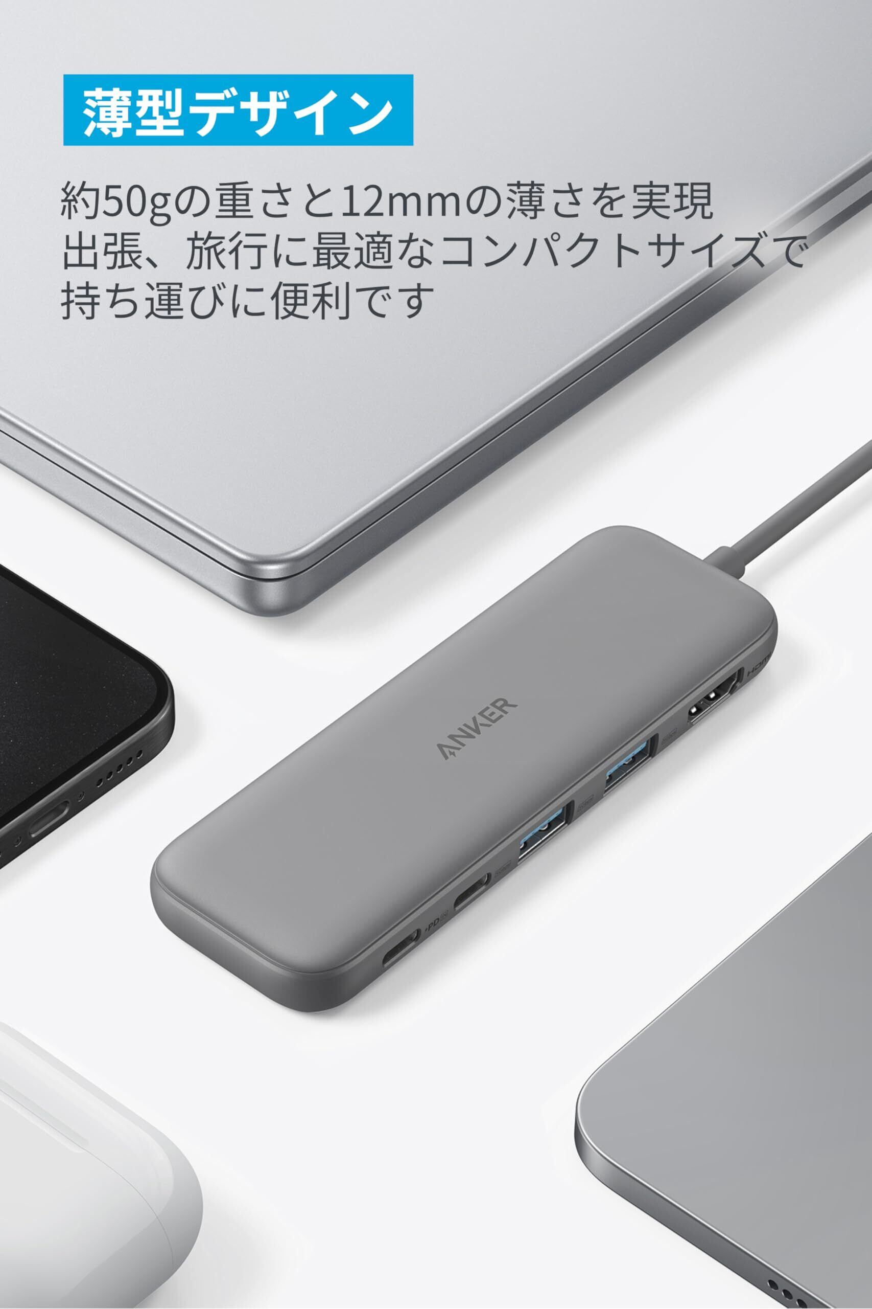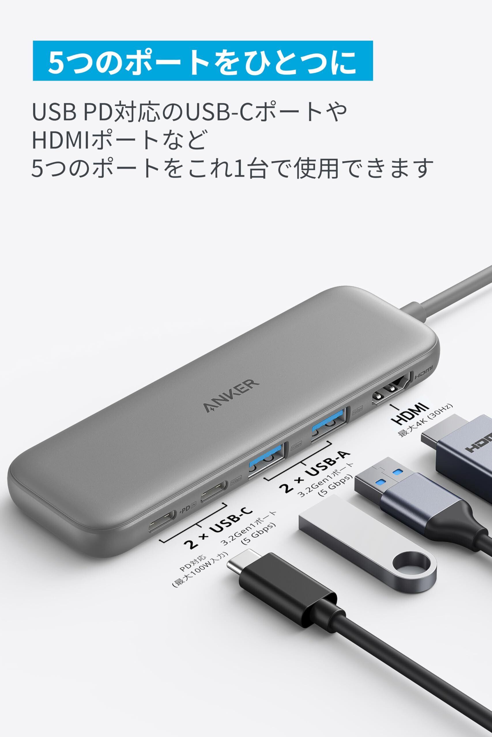 Anker 332 USB-C ハブ (5-in-1) グレー 100W USB PD対応 4K HDMIポート5Gbps 高速データ転送 USB-C/USB-Aポート搭載
