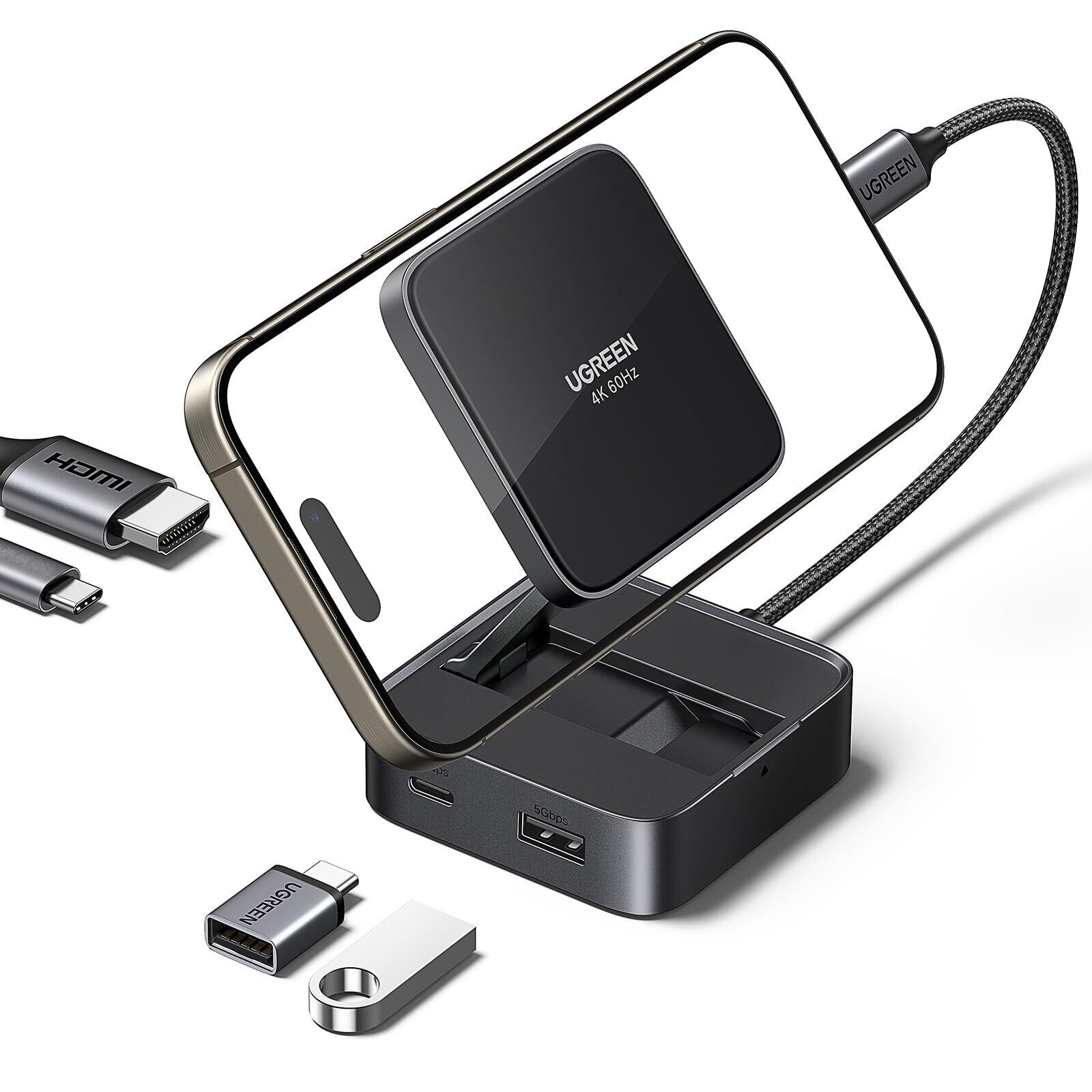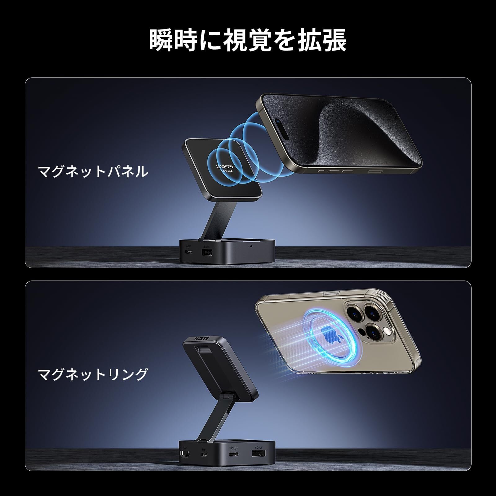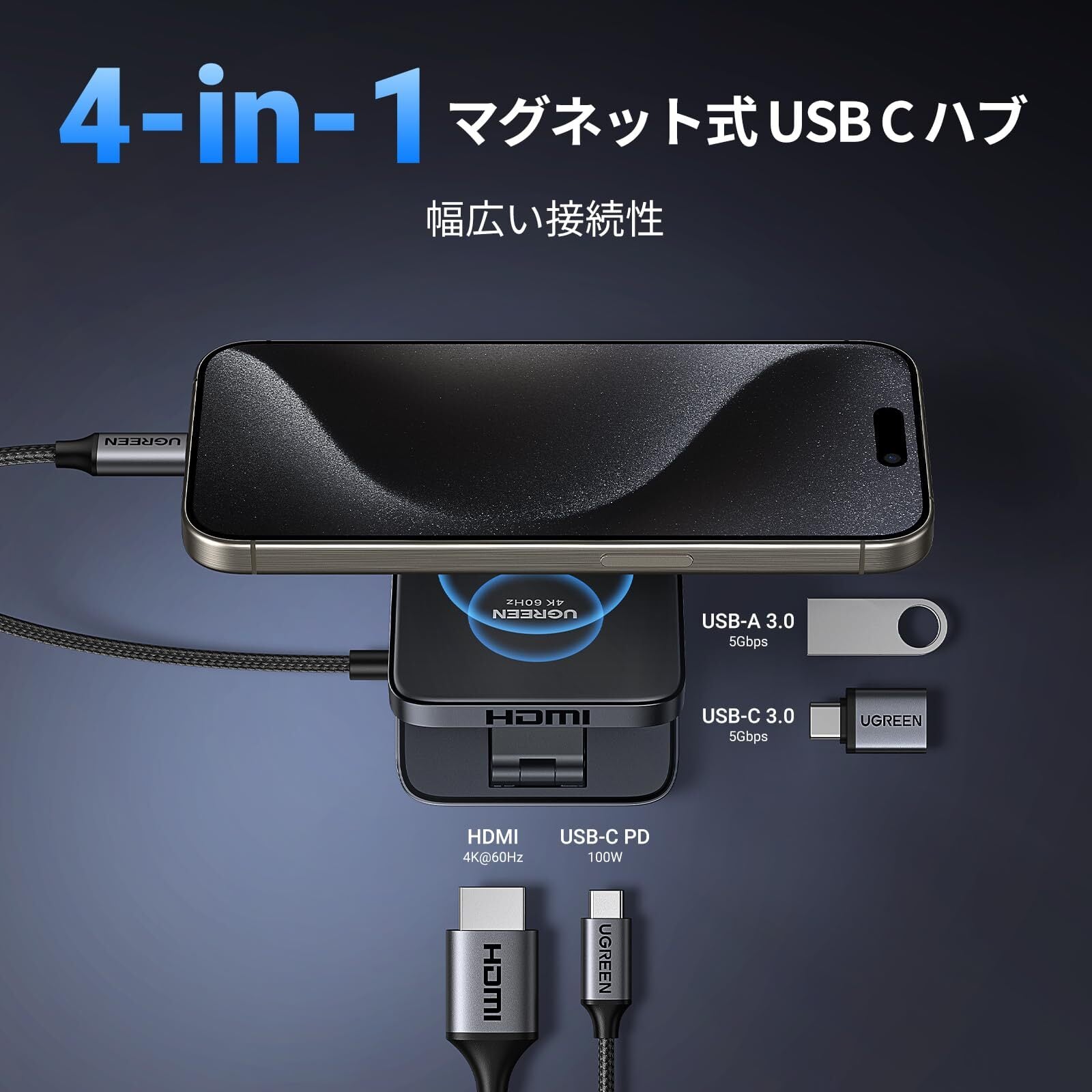 UGREEN USB C ハブ 4-in-1 磁気USB-C HDMI アダプター 4K@60Hz 折りたたみ式ポータブルUSBcハブ 100W PD 充電 USB-A3.0 & USB-C3.0 5Gbpsデータポート iPhone 15/16 シリーズ、Galaxy S24、iPad Pro などに対応 スマホ直接拡張画面 スタンドな設計