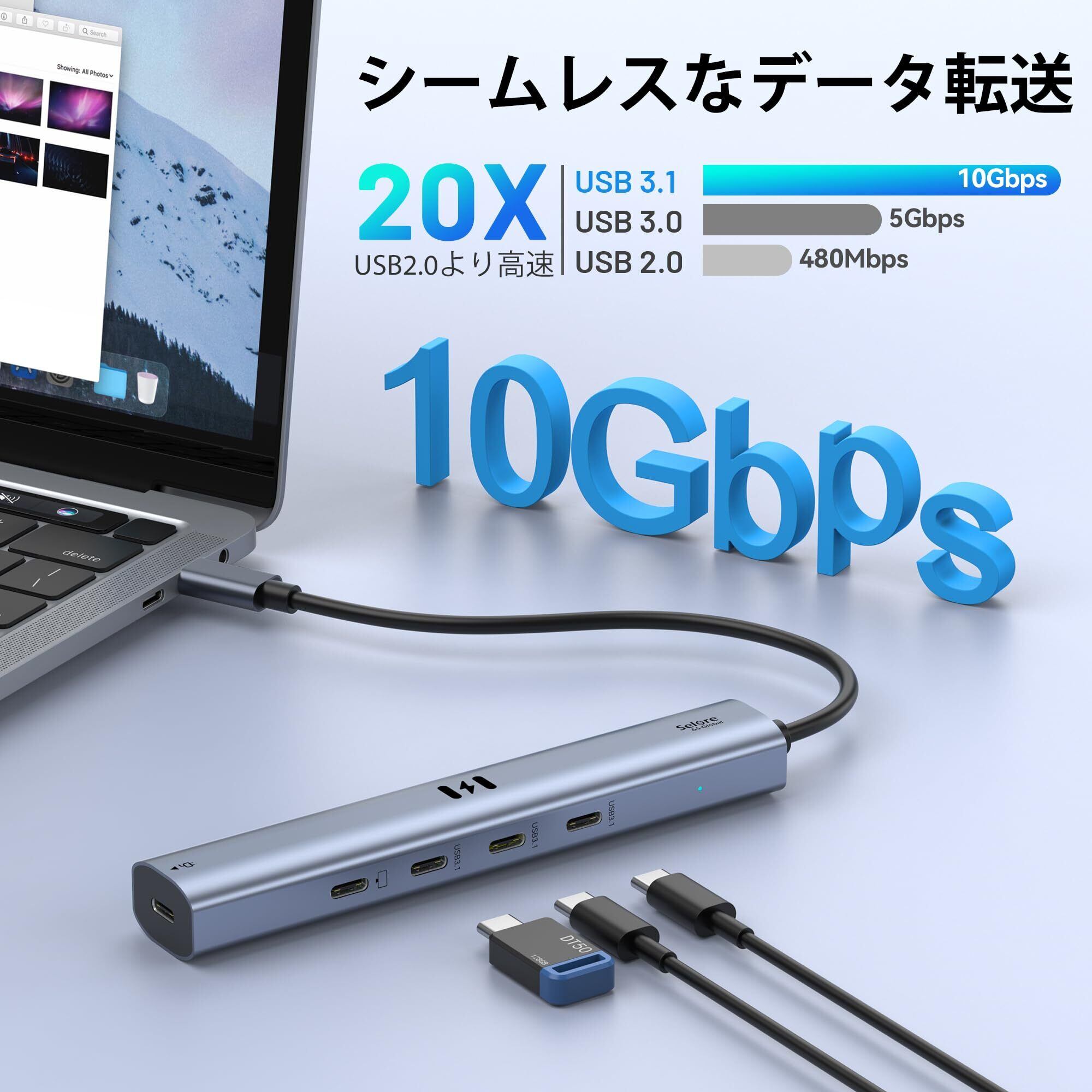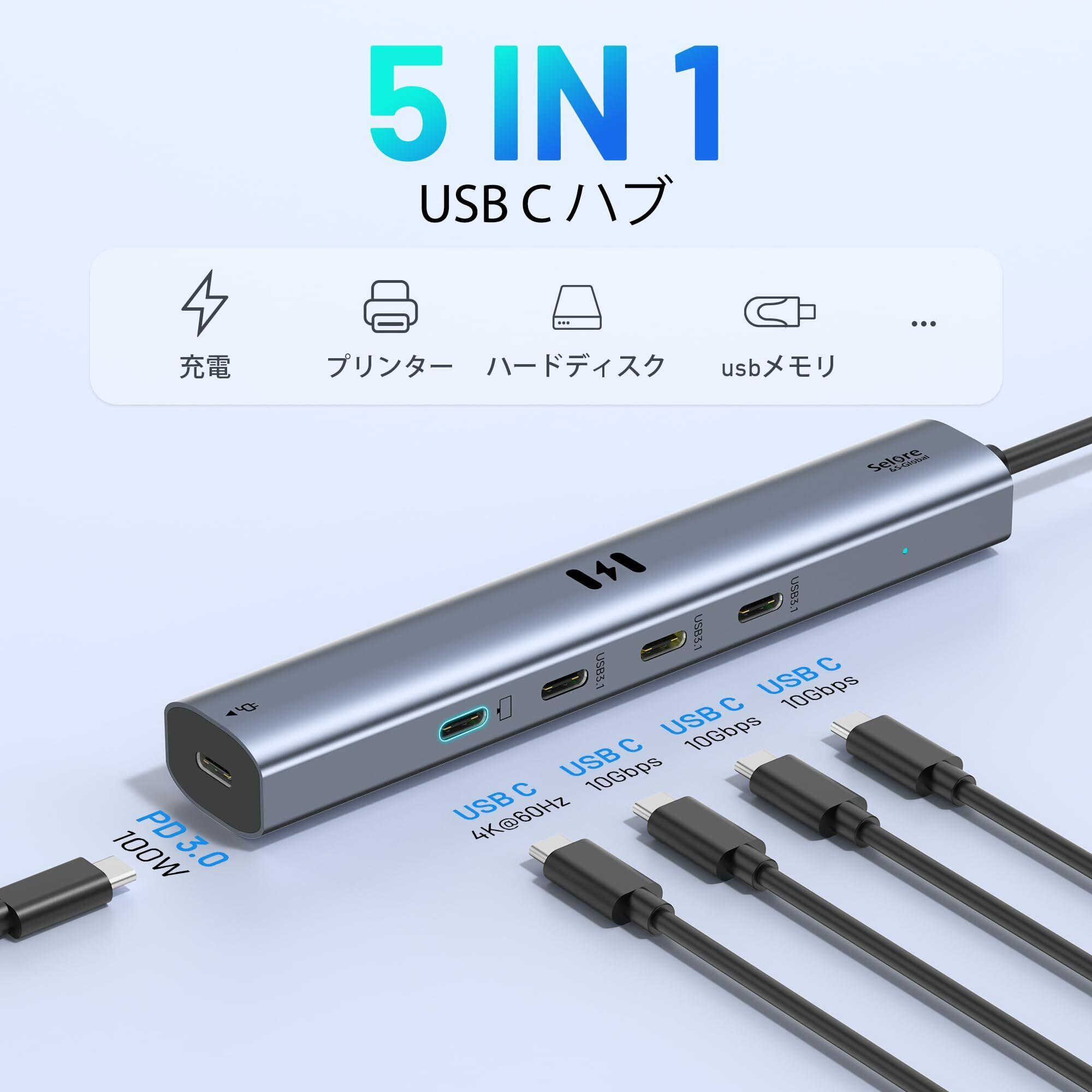 Selore 10Gbps USB Cハブ 5ポート拡張【USB Type-Cポートの1つが映像出力対応】 4xUSB-C ポートとType-c PD100W 電源ポート搭載MacBook Pro/Air, iPad Pro, iPhone 15/16, Surface Pro, Switch, Galaxy Book, Chromebook対応 ノートPC/タブレット用