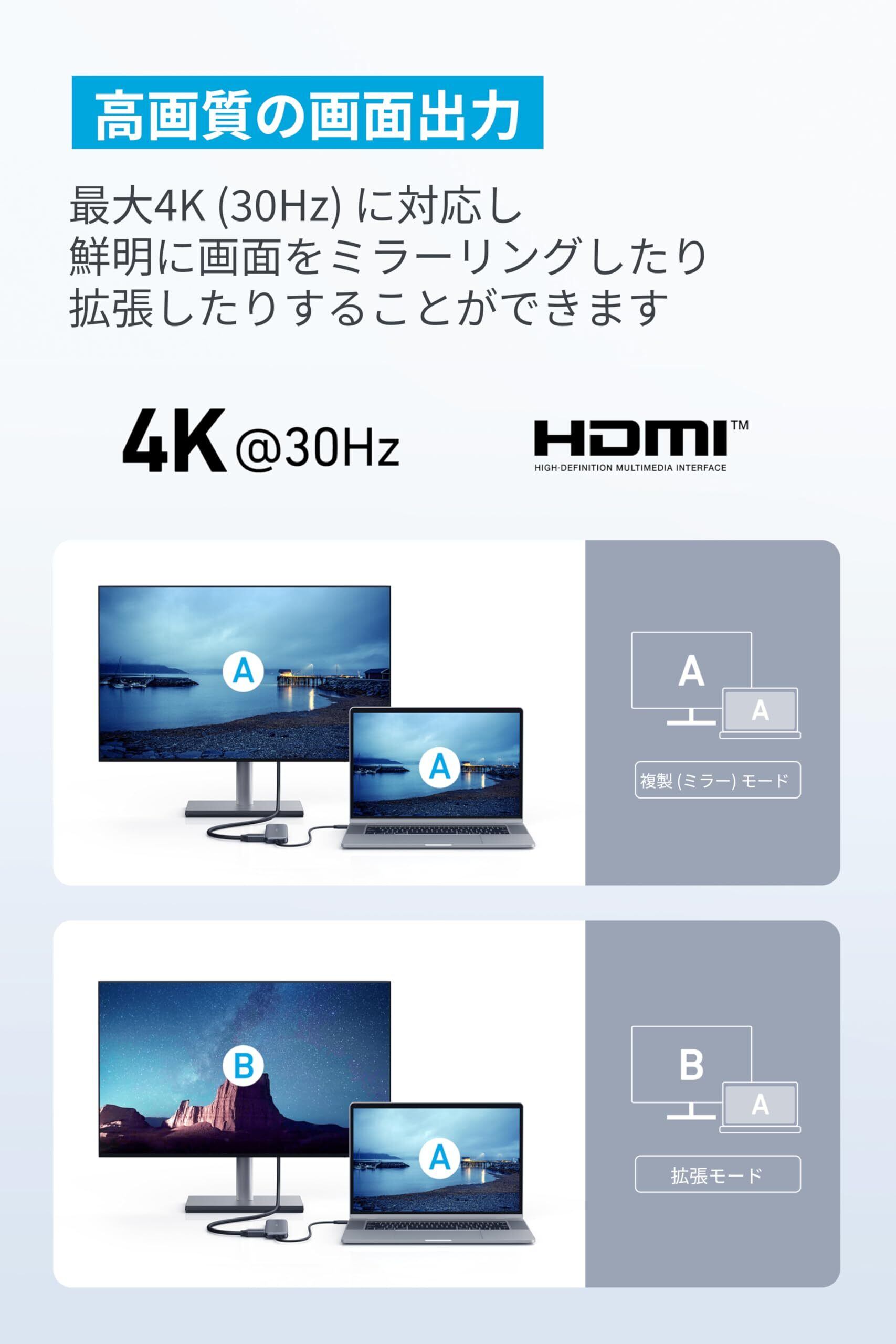 高画質の画面出力:HDMIポートを使用して、最大4K (30Hz) の画像出力が可能です。鮮明に画面をミラーリングしたり拡張したりすることができます。※USB-Cポートは映像出力に非対応です。