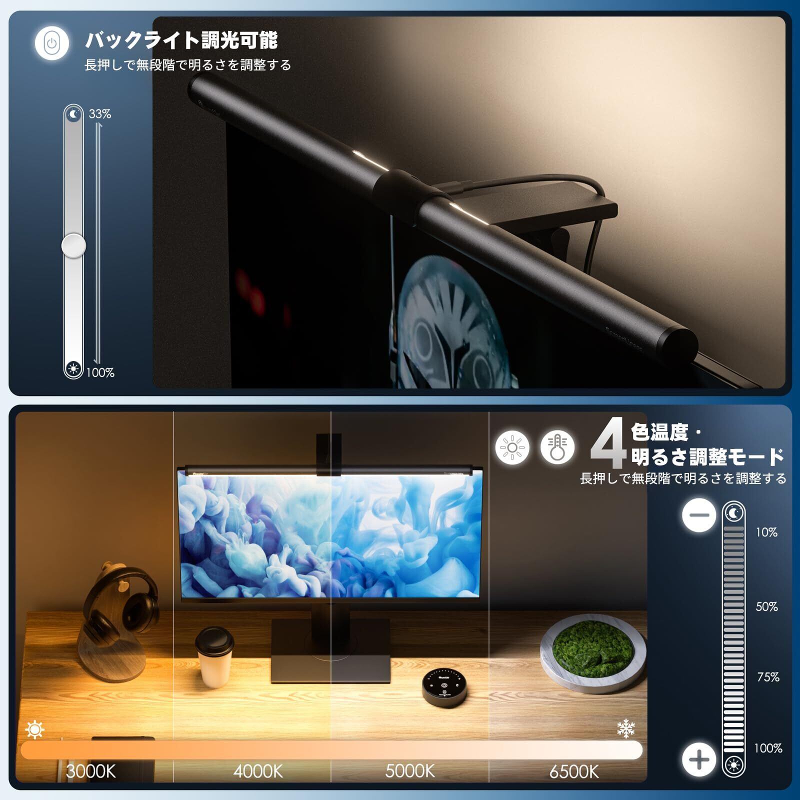 【照明モード&安心のサービス】 簡単な操作で前照明の色温度や明るさを調整し、長押しで無段階調光モードに切り替え可能。Quntisモニターライトは目に優しい照明を提供し、視覚習慣を養成。仕事、読書、ゲームに最適な照明体験を提供します。品質管理には万全を期していますが、商品に不具合があれば注文番号でサポートいたします。