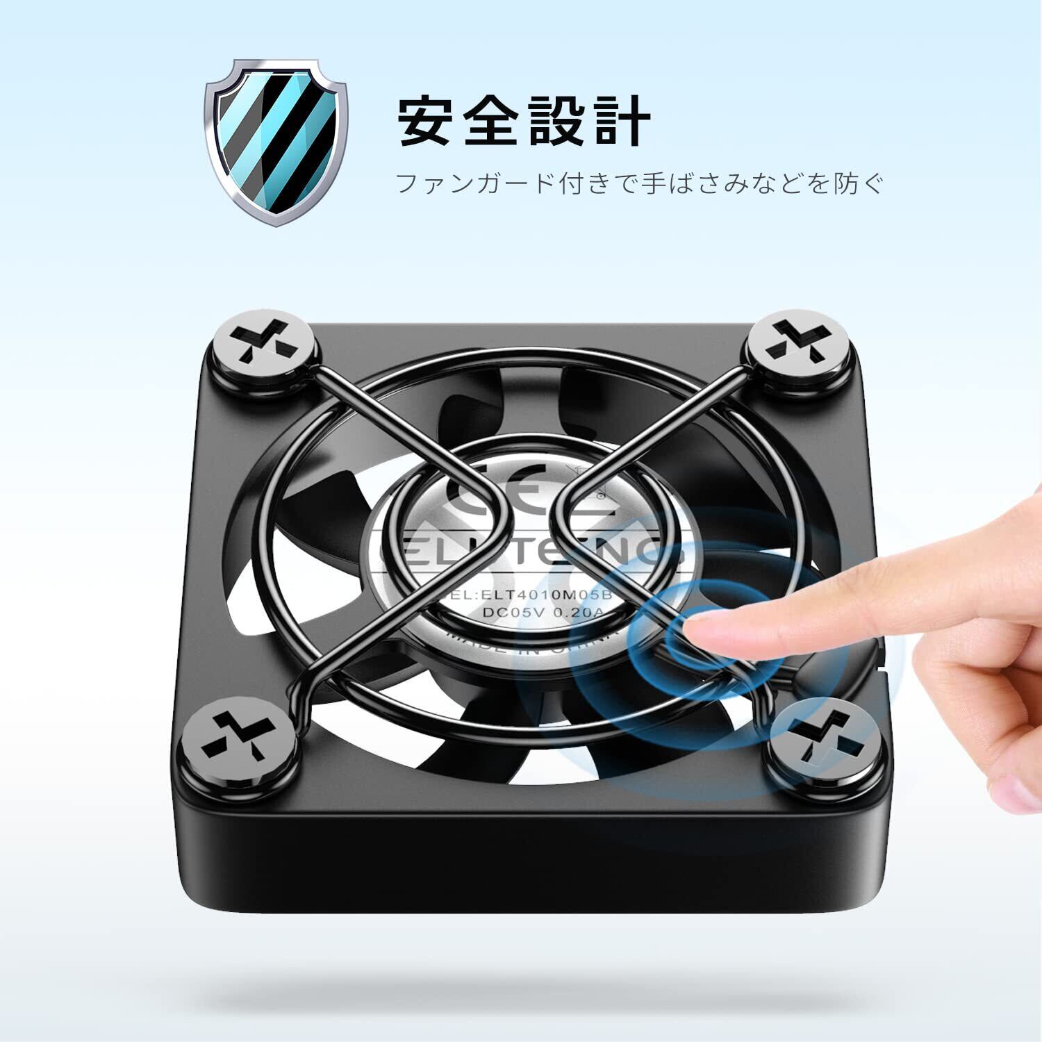 【安全設計】金属製フレーム搭載、稼働中ケガ防止のため安全設計されます。指が入らず、持ちやすくなり、ケーブルなど異物の侵入も防止できます。USBポートに挿したら勝手に動作するようになっています。超静音設計で、自習室、図書館などの静かな場所に使っても、気になりません。