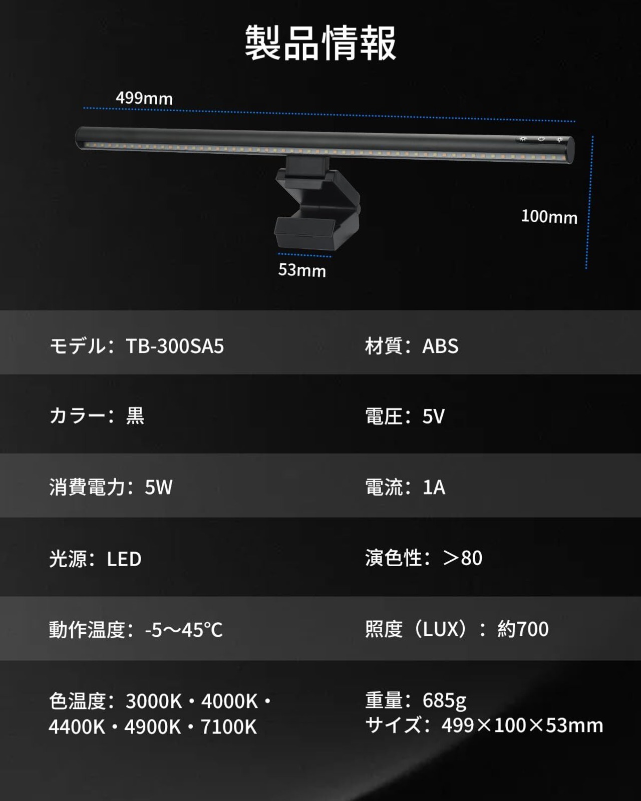 ELUTENG モニターライト 50cm ブラック PCデスクライト 非対称光 目に優しい タッチ調光調色 USB-C給電 厚さ1-5cm対応 5段階色温(3000K-7150K) 3段階調光 ディスプレイ ライト 読書/作業/ゲーミング用