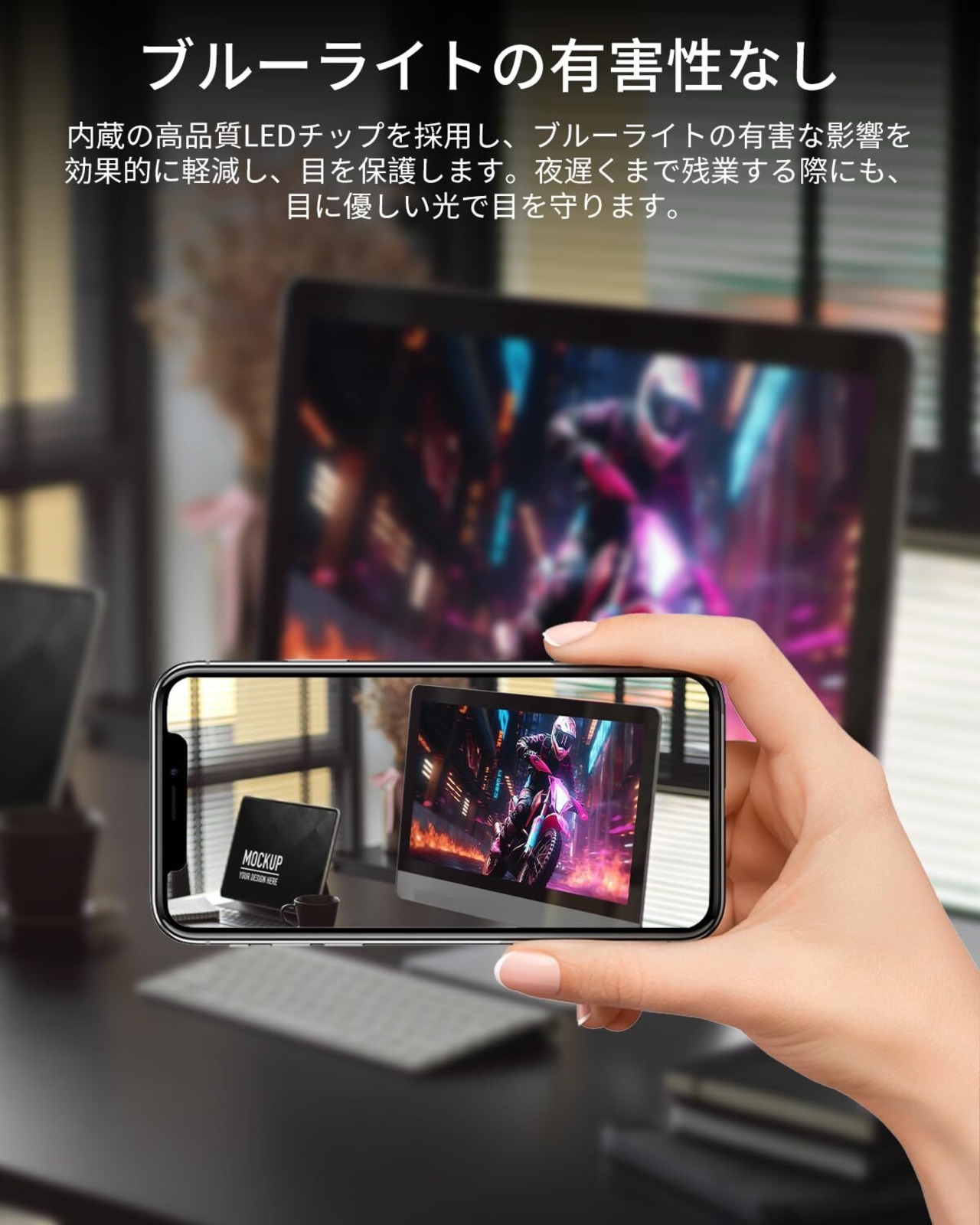 【非対称光 & 高品質光源で徹底護眼】独自の非対称光学設計により、光がデスク面だけを効率的に照らし、モニター画面や目への直接照射・まぶしさを大幅に低減。高品質LEDチップ採用でブルーライト軽減&可視フリッカー(ちらつき)フリー。長時間の作業、読書、ゲームでも目が疲れにくい快適な光環境を実現します。