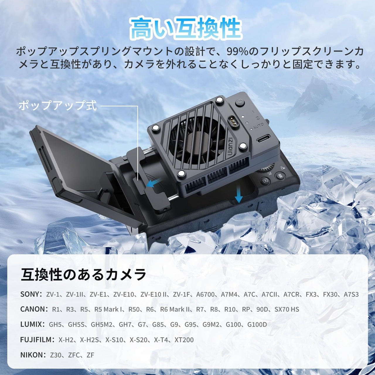 Ulanzi CU01 カメラ用冷却ファン 扇風機 半導体冷凍チップ 発熱対策 自動温度制御 風量調節可 静音設計 スプリングタイプ 冷却クーラー 小型 軽量 Type-c充電式 3000mAh カメラ用ラジエーター 送風機 夏用 排熱 温度表示 ソニー/キヤノン/フジフイルムに対応