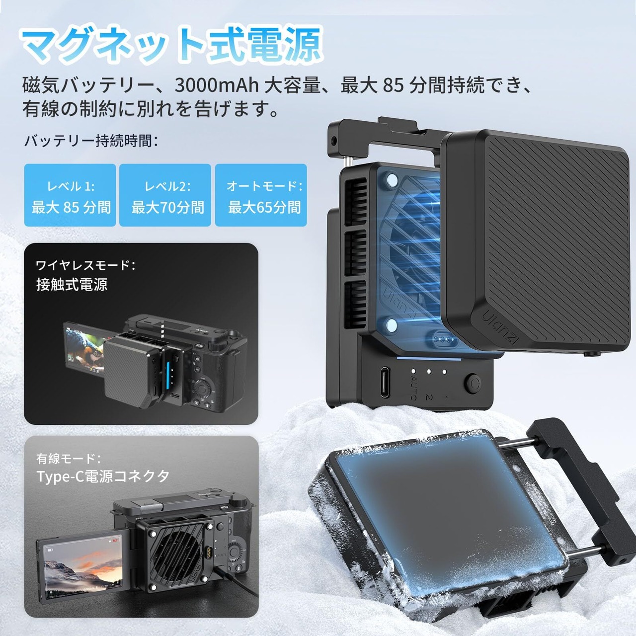 【3000mAh充電池内蔵&使いながら充電】3000mAh 磁気バッテリーはフル充電時で弱風最大約85分間、強風最大約70分時間の連続使用が可能で、外出先でもカメラを涼しく保ちます。Type-Cコネクター、外部電源バンクとの接続オプションにより、使用中に充電することができます。ご注意:充電には5V充電器をご使用ください。