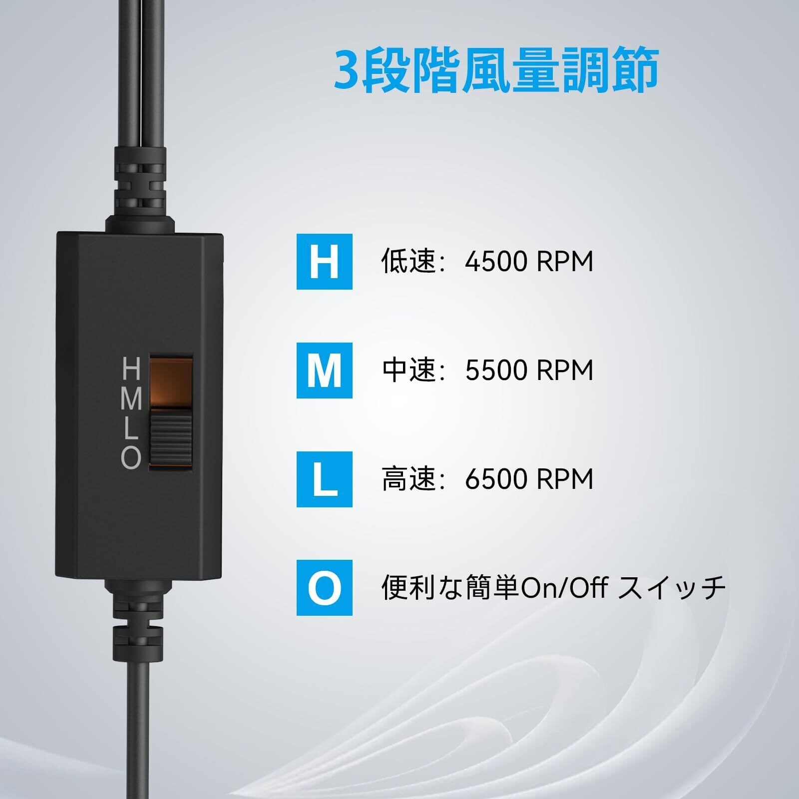 【3段階風速調節可能】パソコン ファンは面倒な配線が無く、USBインターフェースを採用して、プラグを差し込んで使用できます。風速調整スイッチを備えて、風量は3段階で調節可能。風回転数:4500/5500/6500RPM。使用環境や用途に応じて、風量を選択できます。軽量・コンパクトで、場所を取りません。デスクのちょっとした隙間やパソコン本体の上などに置けます。持ち運びと収納も便利です。